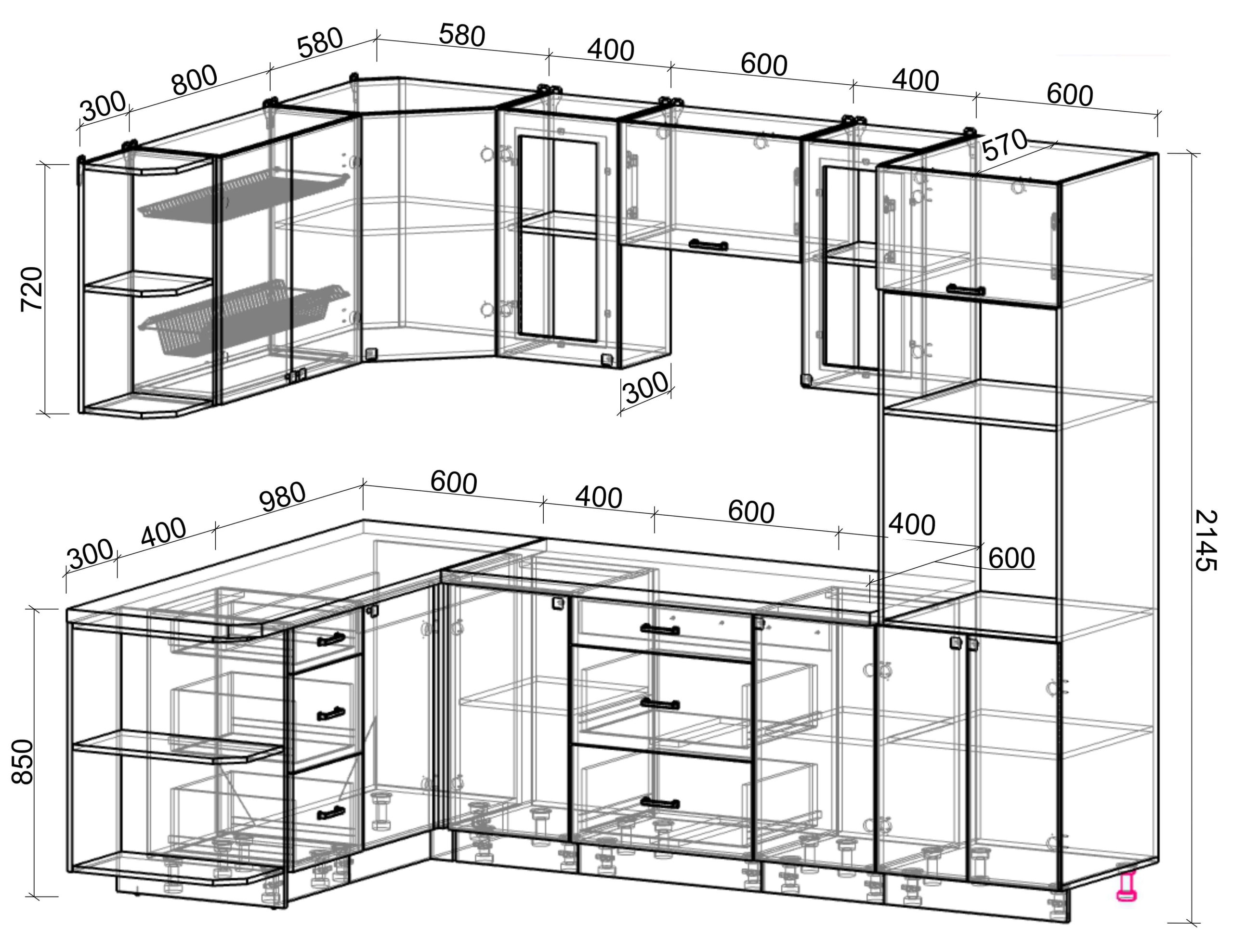 - Столешница (38 мм) отдельная на каждый шкаф или цельная (без увеличения стоимости);