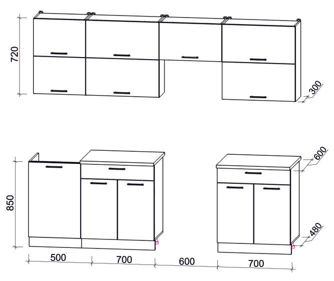 Глубина нижних шкафов 60 см (46 см — глубина по корпусу)