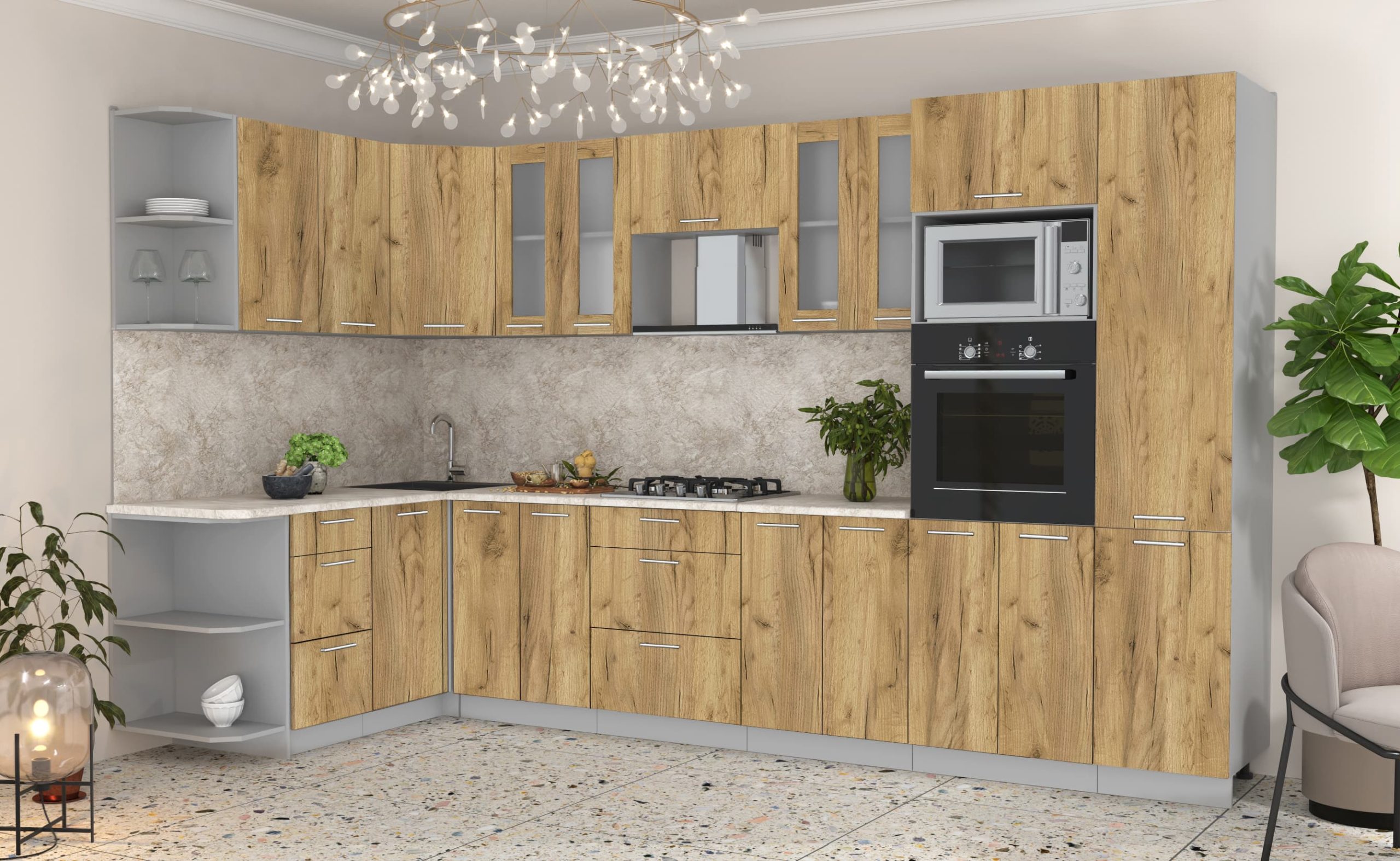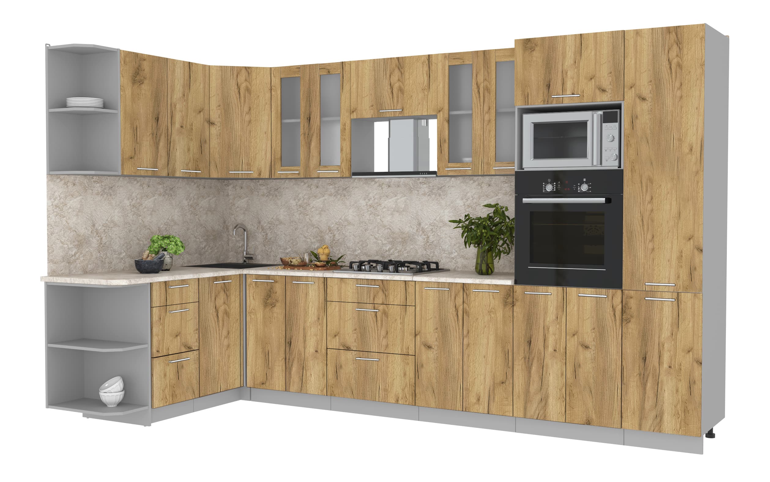 Купить кухню в компании yuta.by можно в виде готового набора или собрать из готовых модулей по индивидуальному заказу. Стандартные наборы и стандартные модули — складская программа. Срок комплектации и упаковки 3-5 рабочих дней. Стоимость и качество Вас приятно удивят и оставят только приятные впечатления. Готовые изделия почти не отличаются от композиций на заказ, так как производится с учетом типовых размеров и основных требований к модулям. Внутреннее наполнение универсального кухонного гарнитура позволяет добиться максимальной функциональности, чтобы легко организовать порядок хранения продуктов и посуды. Предусмотрена возможность встраивания мойки, вытяжки, духового шкафа, а также другой бытовой техники. Поскольку кухня собрана модульно, есть возможность менять шкафчики местами между собой.