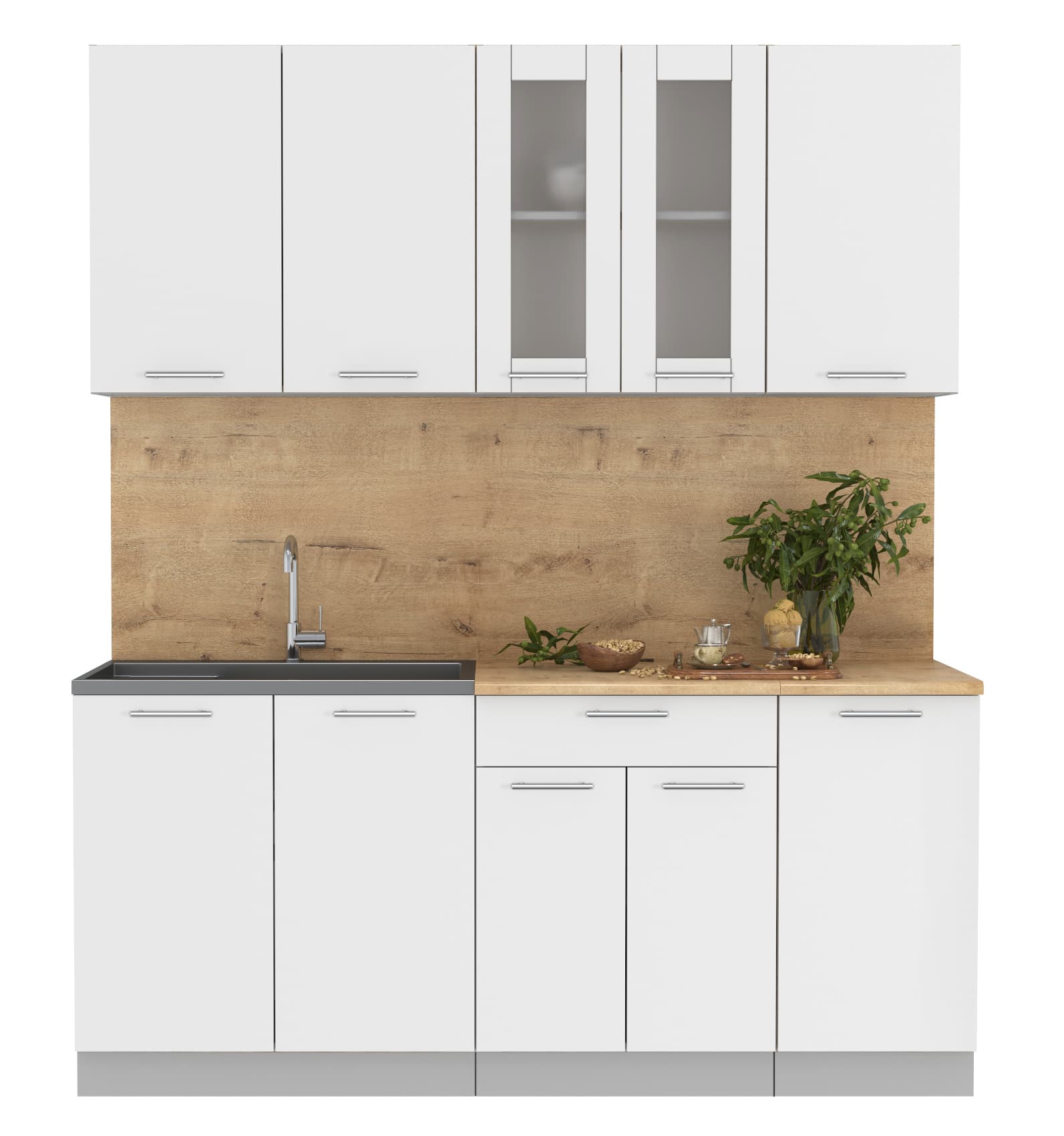 Купить кухню в компании yuta.by можно в виде готового набора или собрать из готовых модулей по индивидуальному заказу. Стандартные наборы и стандартные модули — складская программа. Срок комплектации и упаковки 3-5 рабочих дней. Стоимость и качество Вас приятно удивят и оставят только приятные впечатления. Готовые изделия почти не отличаются от композиций на заказ, так как производится с учетом типовых размеров и основных требований к модулям. Внутреннее наполнение универсального кухонного гарнитура позволяет добиться максимальной функциональности, чтобы легко организовать порядок хранения продуктов и посуды. Предусмотрена возможность встраивания мойки, вытяжки, духового шкафа, а также другой бытовой техники. Поскольку кухня собрана модульно, есть возможность менять шкафчики местами между собой.