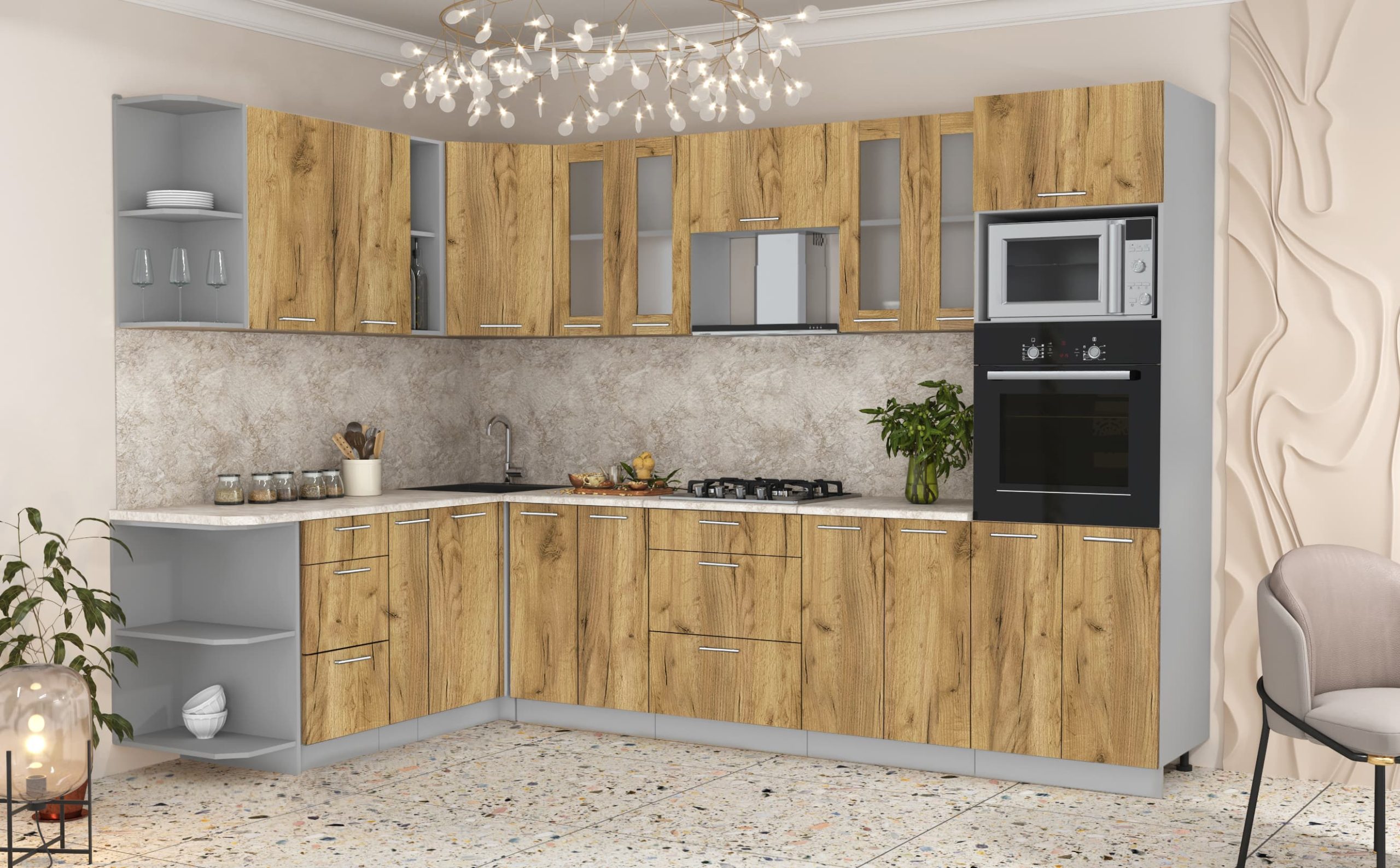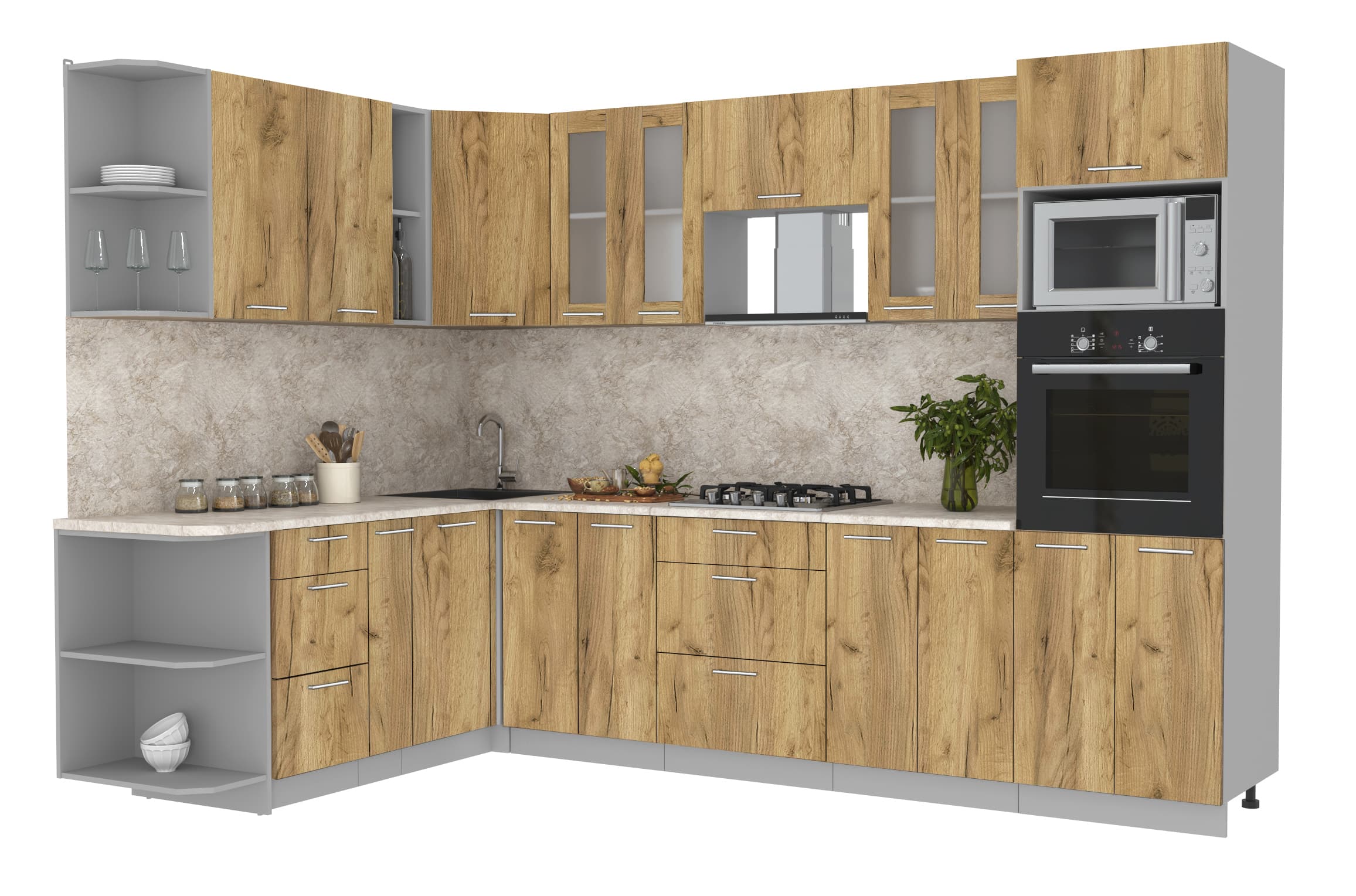 Купить кухню в компании yuta.by можно в виде готового набора или собрать из готовых модулей по индивидуальному заказу. Стандартные наборы и стандартные модули — складская программа. Срок комплектации и упаковки 3-5 рабочих дней. Стоимость и качество Вас приятно удивят и оставят только приятные впечатления. Готовые изделия почти не отличаются от композиций на заказ, так как производится с учетом типовых размеров и основных требований к модулям. Внутреннее наполнение универсального кухонного гарнитура позволяет добиться максимальной функциональности, чтобы легко организовать порядок хранения продуктов и посуды. Предусмотрена возможность встраивания мойки, вытяжки, духового шкафа, а также другой бытовой техники. Поскольку кухня собрана модульно, есть возможность менять шкафчики местами между собой.