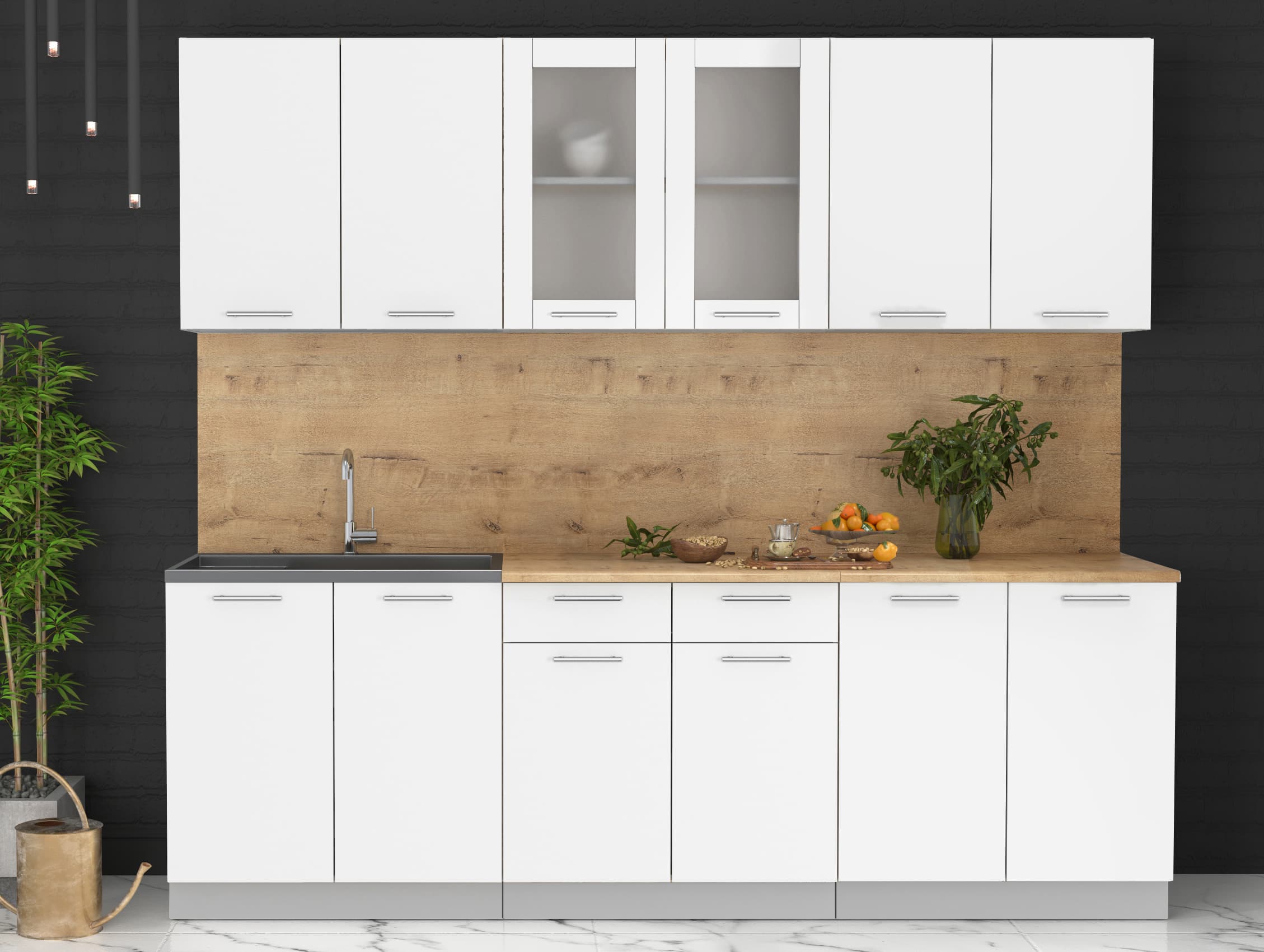 Купить кухню в компании yuta.by можно в виде готового набора или собрать из готовых модулей по индивидуальному заказу. Стандартные наборы и стандартные модули — складская программа. Срок комплектации и упаковки 3-5 рабочих дней. Стоимость и качество Вас приятно удивят и оставят только приятные впечатления. Готовые изделия почти не отличаются от композиций на заказ, так как производится с учетом типовых размеров и основных требований к модулям. Внутреннее наполнение универсального кухонного гарнитура позволяет добиться максимальной функциональности, чтобы легко организовать порядок хранения продуктов и посуды. Предусмотрена возможность встраивания мойки, вытяжки, духового шкафа, а также другой бытовой техники. Поскольку кухня собрана модульно, есть возможность менять шкафчики местами между собой.