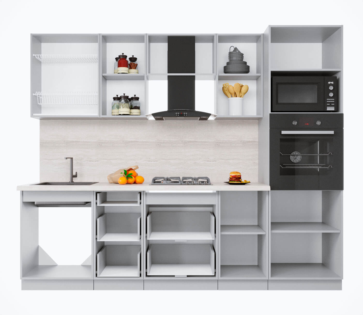 Купить кухню в компании yuta.by можно в виде готового набора или собрать из готовых модулей по индивидуальному заказу. Стандартные наборы и стандартные модули — складская программа. Срок комплектации и упаковки 3-5 рабочих дней. Стоимость и качество Вас приятно удивят и оставят только приятные впечатления. Готовые изделия почти не отличаются от композиций на заказ, так как производится с учетом типовых размеров и основных требований к модулям. Внутреннее наполнение универсального кухонного гарнитура позволяет добиться максимальной функциональности, чтобы легко организовать порядок хранения продуктов и посуды. Предусмотрена возможность встраивания мойки, вытяжки, духового шкафа, а также другой бытовой техники. Поскольку кухня собрана модульно, есть возможность менять шкафчики местами между собой.