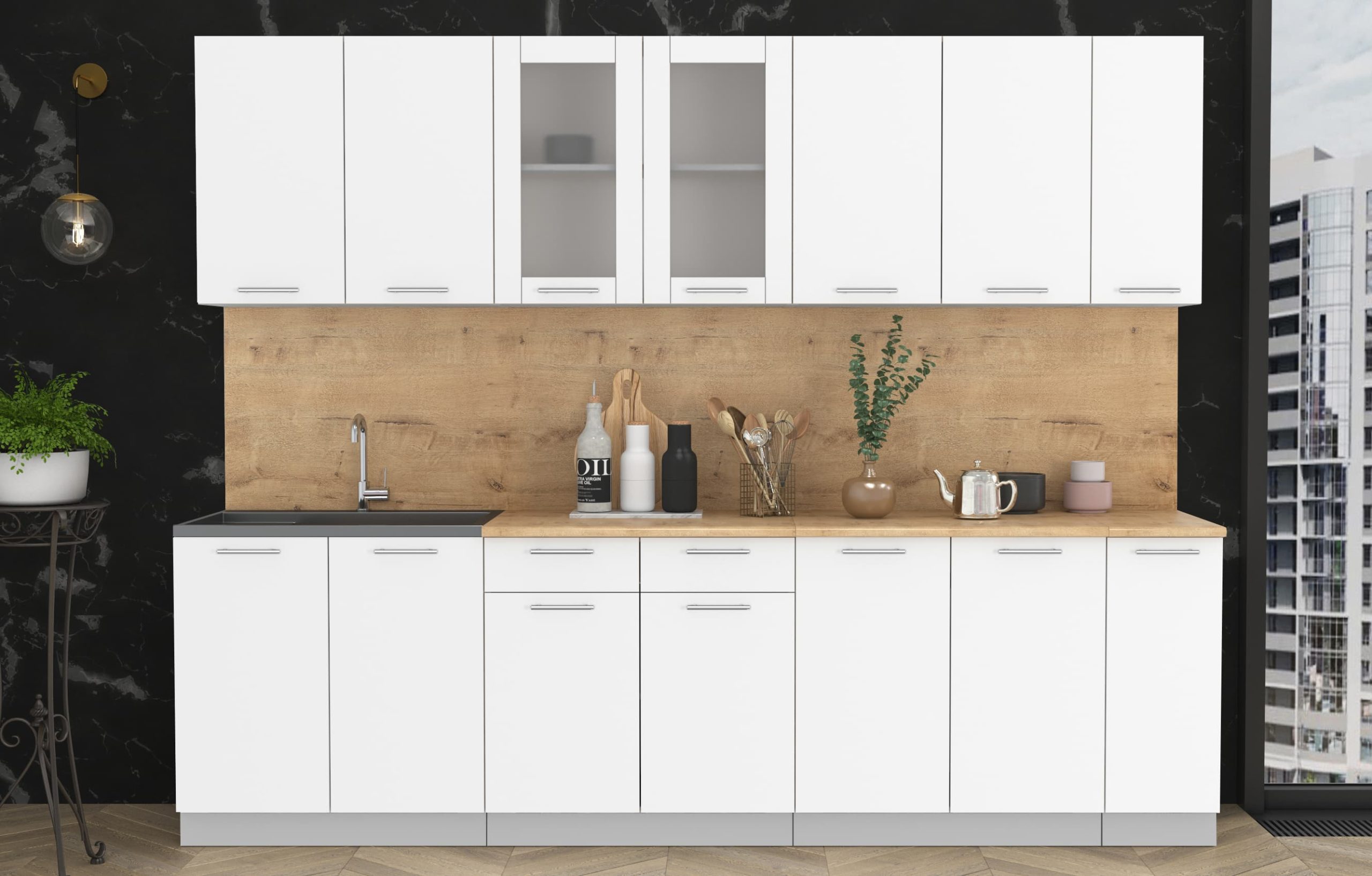 Купить кухню в компании yuta.by можно в виде готового набора или собрать из готовых модулей по индивидуальному заказу. Стандартные наборы и стандартные модули — складская программа. Срок комплектации и упаковки 3-5 рабочих дней. Стоимость и качество Вас приятно удивят и оставят только приятные впечатления. Готовые изделия почти не отличаются от композиций на заказ, так как производится с учетом типовых размеров и основных требований к модулям. Внутреннее наполнение универсального кухонного гарнитура позволяет добиться максимальной функциональности, чтобы легко организовать порядок хранения продуктов и посуды. Предусмотрена возможность встраивания мойки, вытяжки, духового шкафа, а также другой бытовой техники. Поскольку кухня собрана модульно, есть возможность менять шкафчики местами между собой.