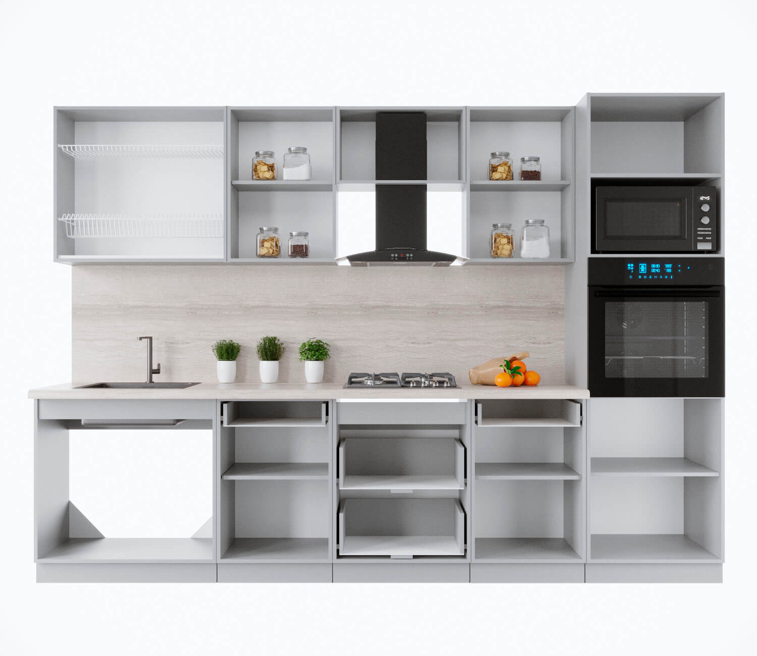 Купить кухню в компании yuta.by можно в виде готового набора или собрать из готовых модулей по индивидуальному заказу. Стандартные наборы и стандартные модули — складская программа. Срок комплектации и упаковки 3-5 рабочих дней. Стоимость и качество Вас приятно удивят и оставят только приятные впечатления. Готовые изделия почти не отличаются от композиций на заказ, так как производится с учетом типовых размеров и основных требований к модулям. Внутреннее наполнение универсального кухонного гарнитура позволяет добиться максимальной функциональности, чтобы легко организовать порядок хранения продуктов и посуды. Предусмотрена возможность встраивания мойки, вытяжки, духового шкафа, а также другой бытовой техники. Поскольку кухня собрана модульно, есть возможность менять шкафчики местами между собой.