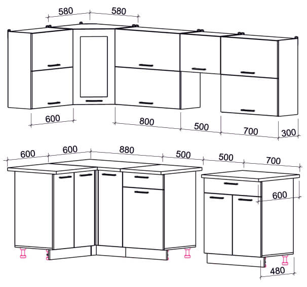 Глубина нижних шкафов 60 см (46 см — глубина по корпусу)
