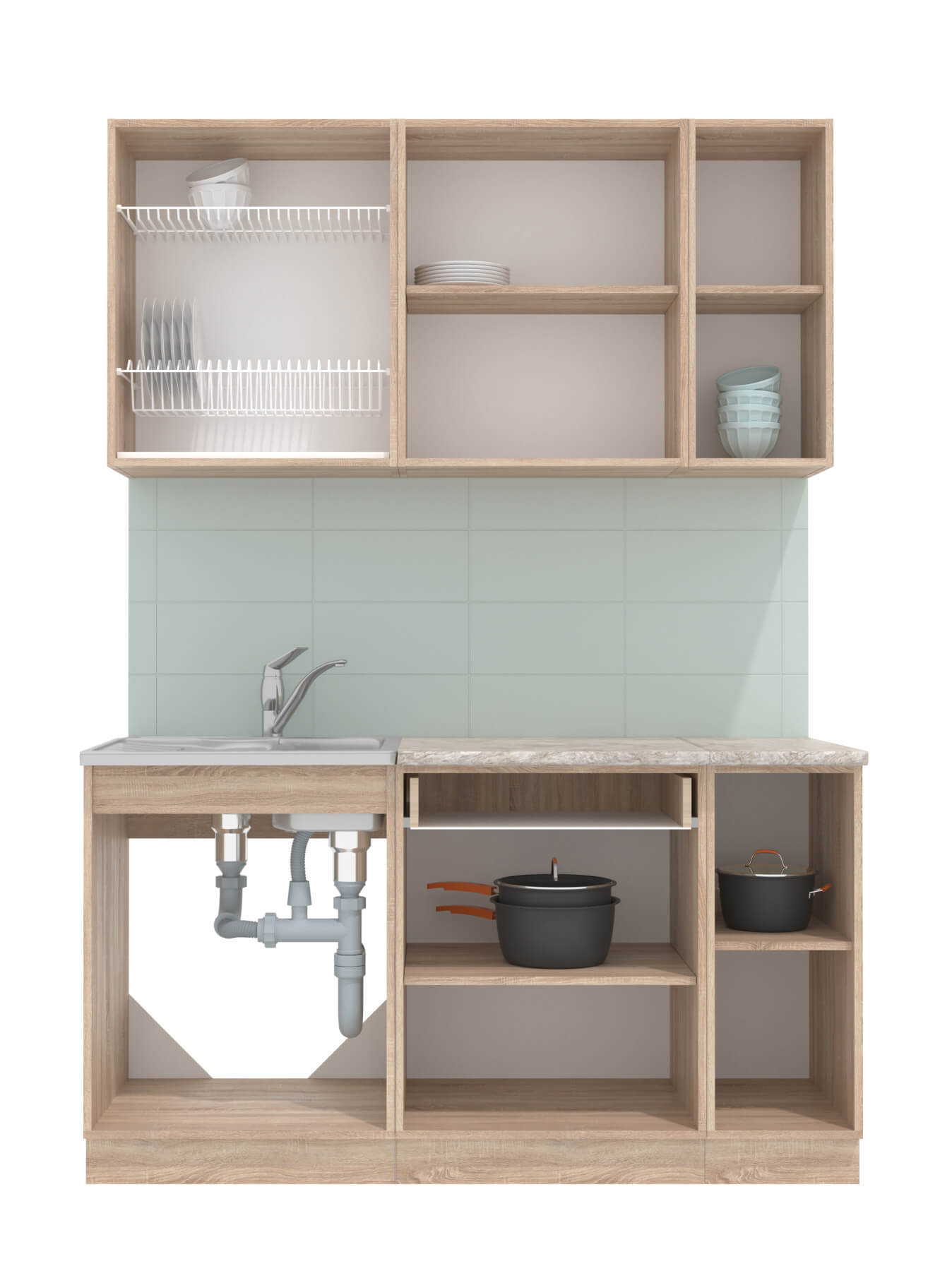 Купить кухню в компании yuta.by можно в виде готового набора или собрать из готовых модулей по индивидуальному заказу. Стандартные наборы и стандартные модули — складская программа. Срок комплектации и упаковки 3-5 рабочих дней. Стоимость и качество Вас приятно удивят и оставят только приятные впечатления. Готовые изделия почти не отличаются от композиций на заказ, так как производится с учетом типовых размеров и основных требований к модулям. Внутреннее наполнение универсального кухонного гарнитура позволяет добиться максимальной функциональности, чтобы легко организовать порядок хранения продуктов и посуды. Предусмотрена возможность встраивания мойки, вытяжки, духового шкафа, а также другой бытовой техники. Поскольку кухня собрана модульно, есть возможность менять шкафчики местами между собой.