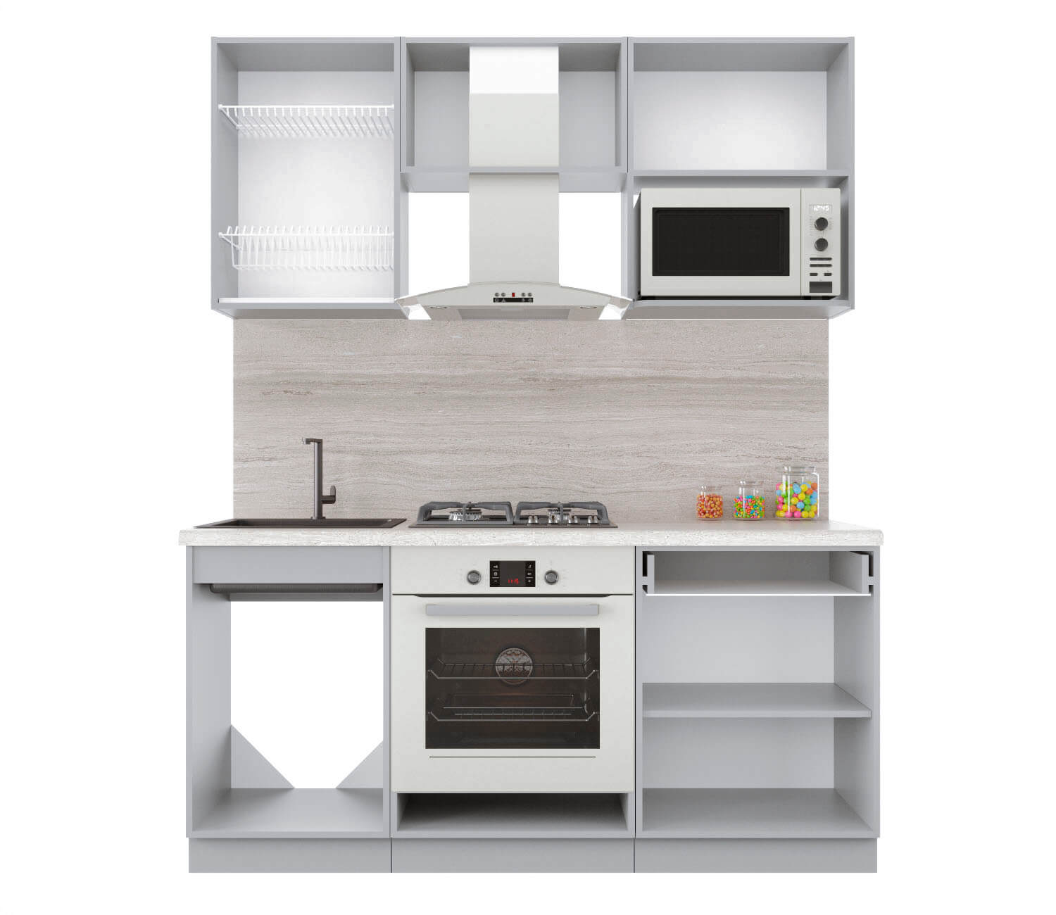 Купить кухню в компании yuta.by можно в виде готового набора или собрать из готовых модулей по индивидуальному заказу. Стандартные наборы и стандартные модули — складская программа. Срок комплектации и упаковки 3-5 рабочих дней. Стоимость и качество Вас приятно удивят и оставят только приятные впечатления. Готовые изделия почти не отличаются от композиций на заказ, так как производится с учетом типовых размеров и основных требований к модулям. Внутреннее наполнение универсального кухонного гарнитура позволяет добиться максимальной функциональности, чтобы легко организовать порядок хранения продуктов и посуды. Предусмотрена возможность встраивания мойки, вытяжки, духового шкафа, а также другой бытовой техники. Поскольку кухня собрана модульно, есть возможность менять шкафчики местами между собой.