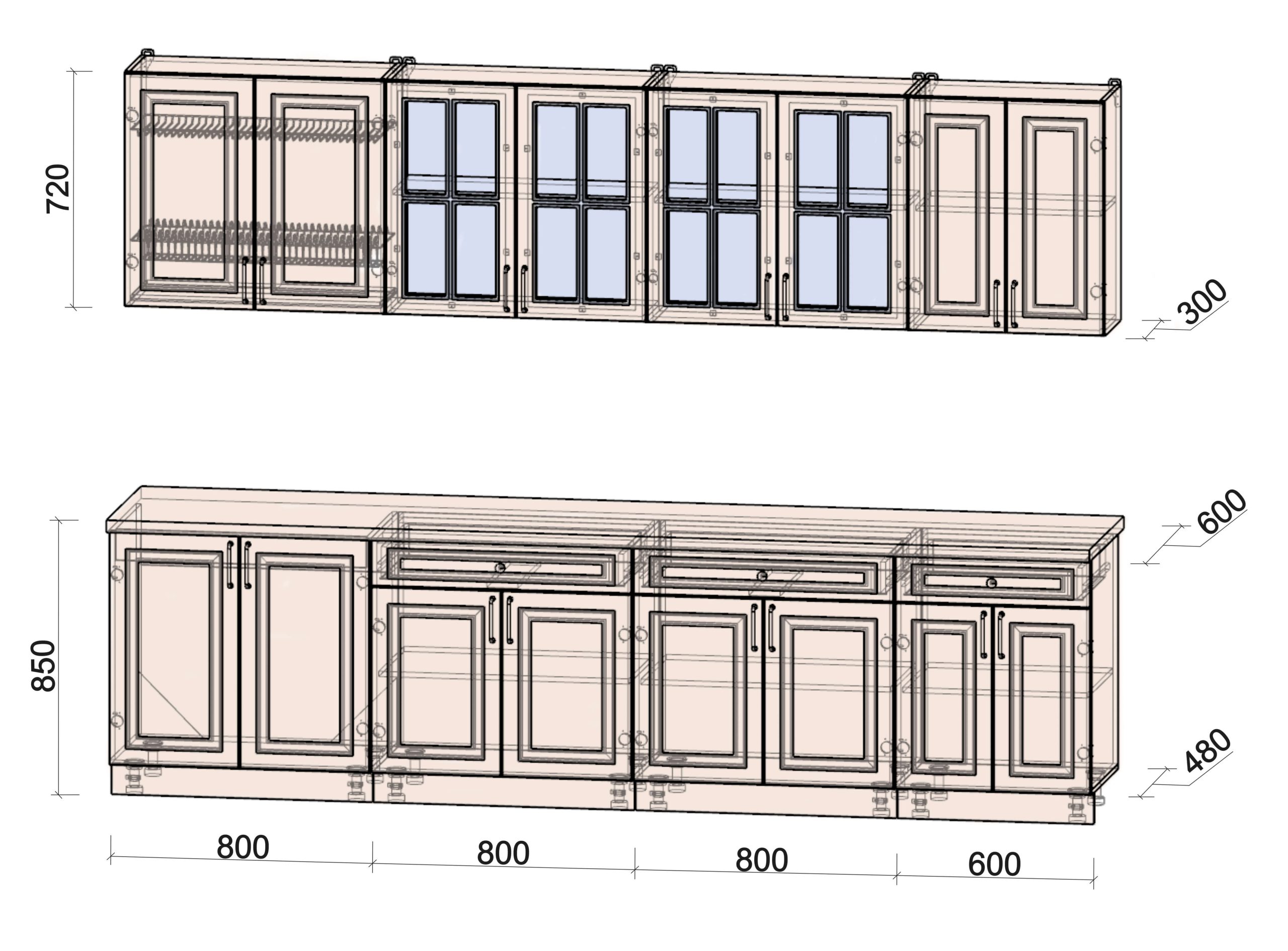 • Заказать кухню Мила «Шато» можно в виде готового набора и по модулям;