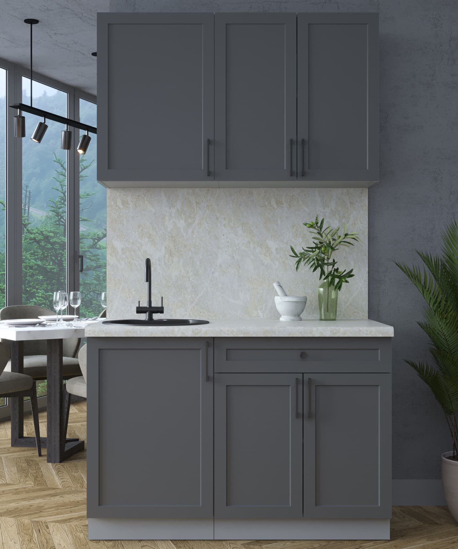 Кухни «Тренд» – отличительной особенностью является фасад с витриной со стеклом «Тонированный графит» и металлические ручки в черном цвете. Максимально актуальное решение для нынешних интерьеров: совокупность практичности, спокойной палитры цветов и элегантного минимализма в фактуре целесообразно как в больших, так и в маленьких помещениях. Принимая решение приоБеларусьи кухню «Тренд», Вы совершаете выбор в пользу лаконичности и функциональности по крайне приятной цене.