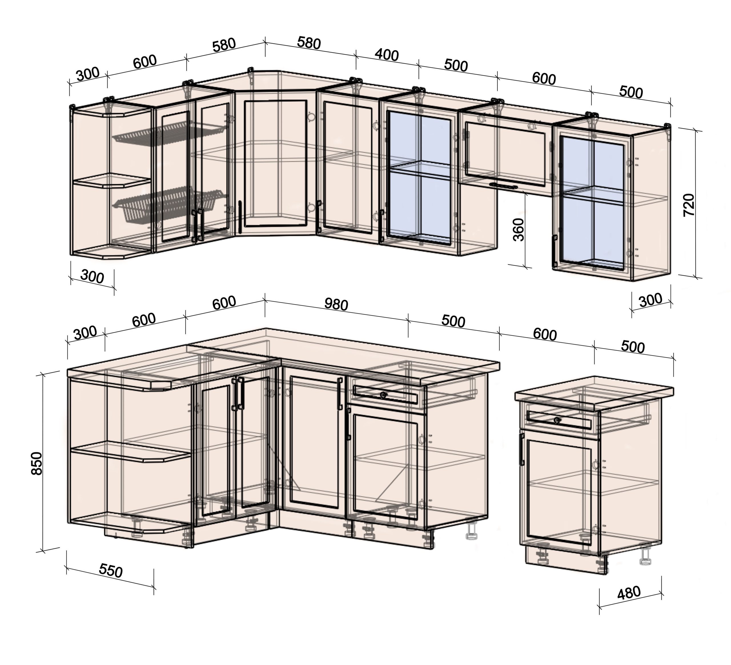 • Столешница (38 мм) отдельная на каждый шкаф или цельная (без увеличения стоимости);