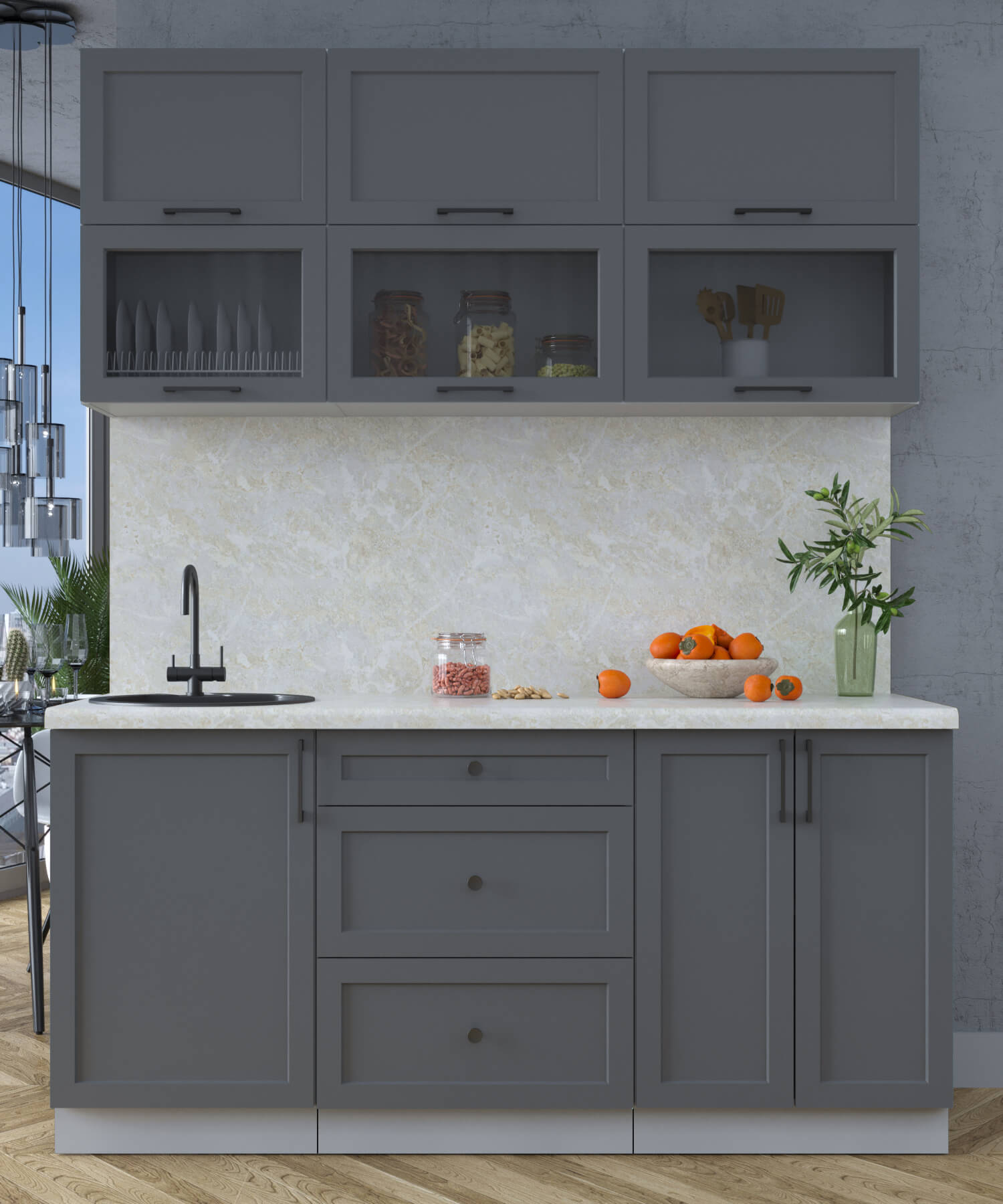 Кухни «Тренд» – отличительной особенностью является фасад с витриной со стеклом «Тонированный графит» и металлические ручки в черном цвете. Максимально актуальное решение для нынешних интерьеров: совокупность практичности, спокойной палитры цветов и элегантного минимализма в фактуре целесообразно как в больших, так и в маленьких помещениях. Принимая решение приоБеларусьи кухню «Тренд», Вы совершаете выбор в пользу лаконичности и функциональности по крайне приятной цене.