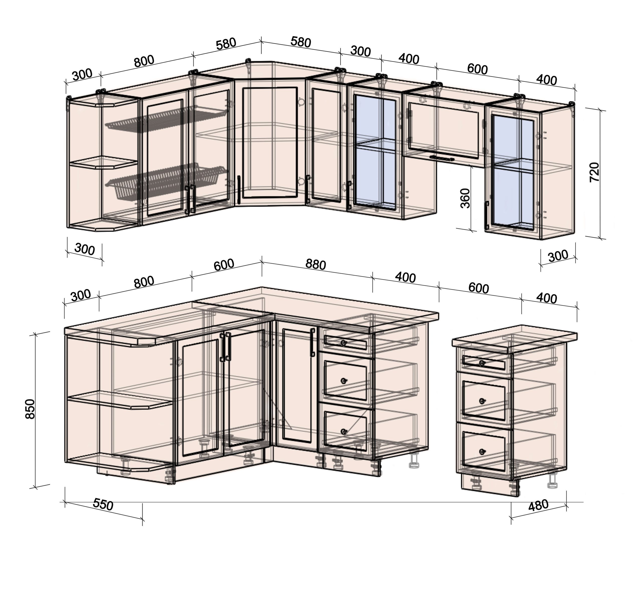 • Столешница (38 мм) отдельная на каждый шкаф или цельная (без увеличения стоимости);