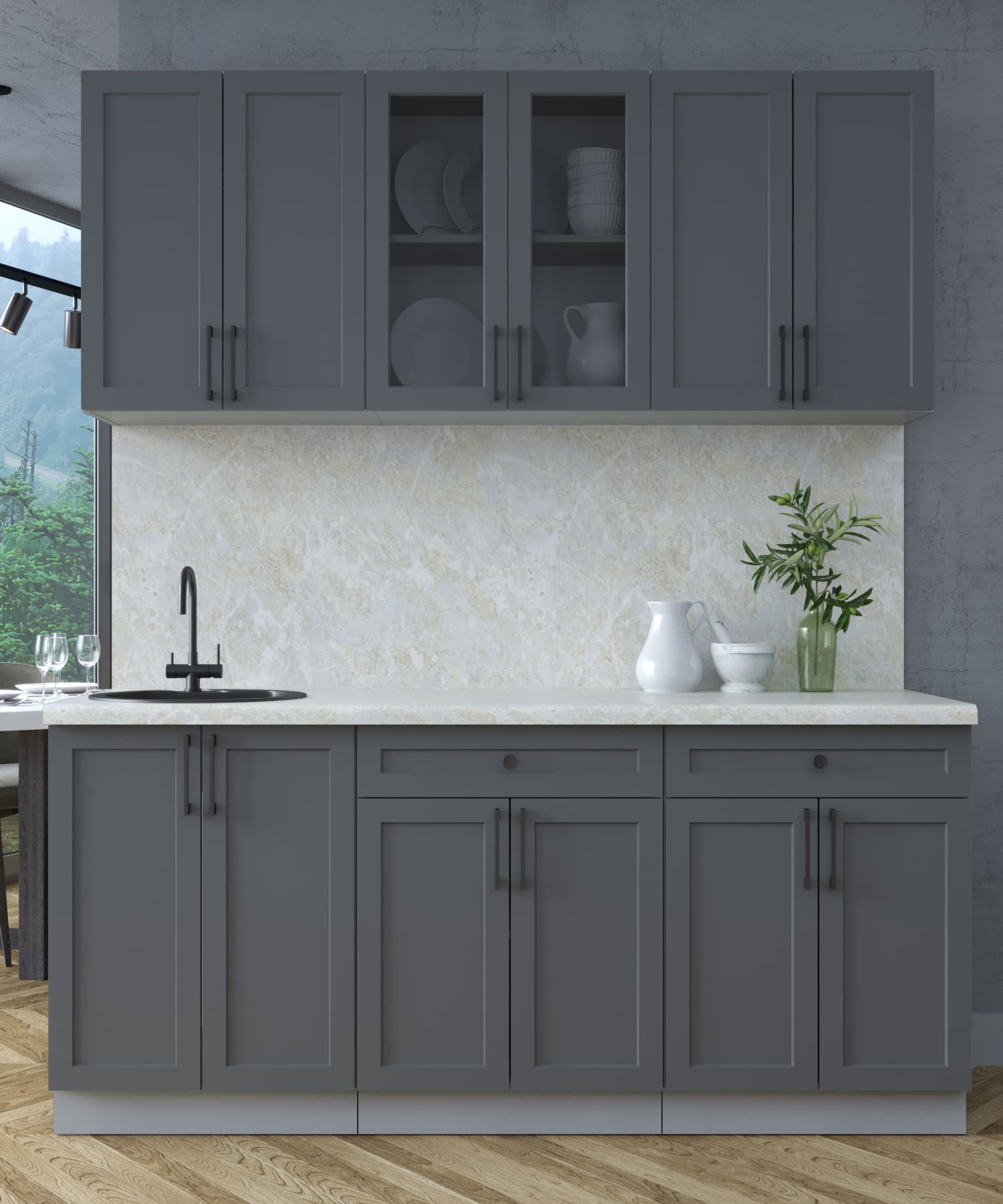 Кухни «Тренд» – отличительной особенностью является фасад с витриной со стеклом «Тонированный графит» и металлические ручки в черном цвете. Максимально актуальное решение для нынешних интерьеров: совокупность практичности, спокойной палитры цветов и элегантного минимализма в фактуре целесообразно как в больших, так и в маленьких помещениях. Принимая решение приоБеларусьи кухню «Тренд», Вы совершаете выбор в пользу лаконичности и функциональности по крайне приятной цене.