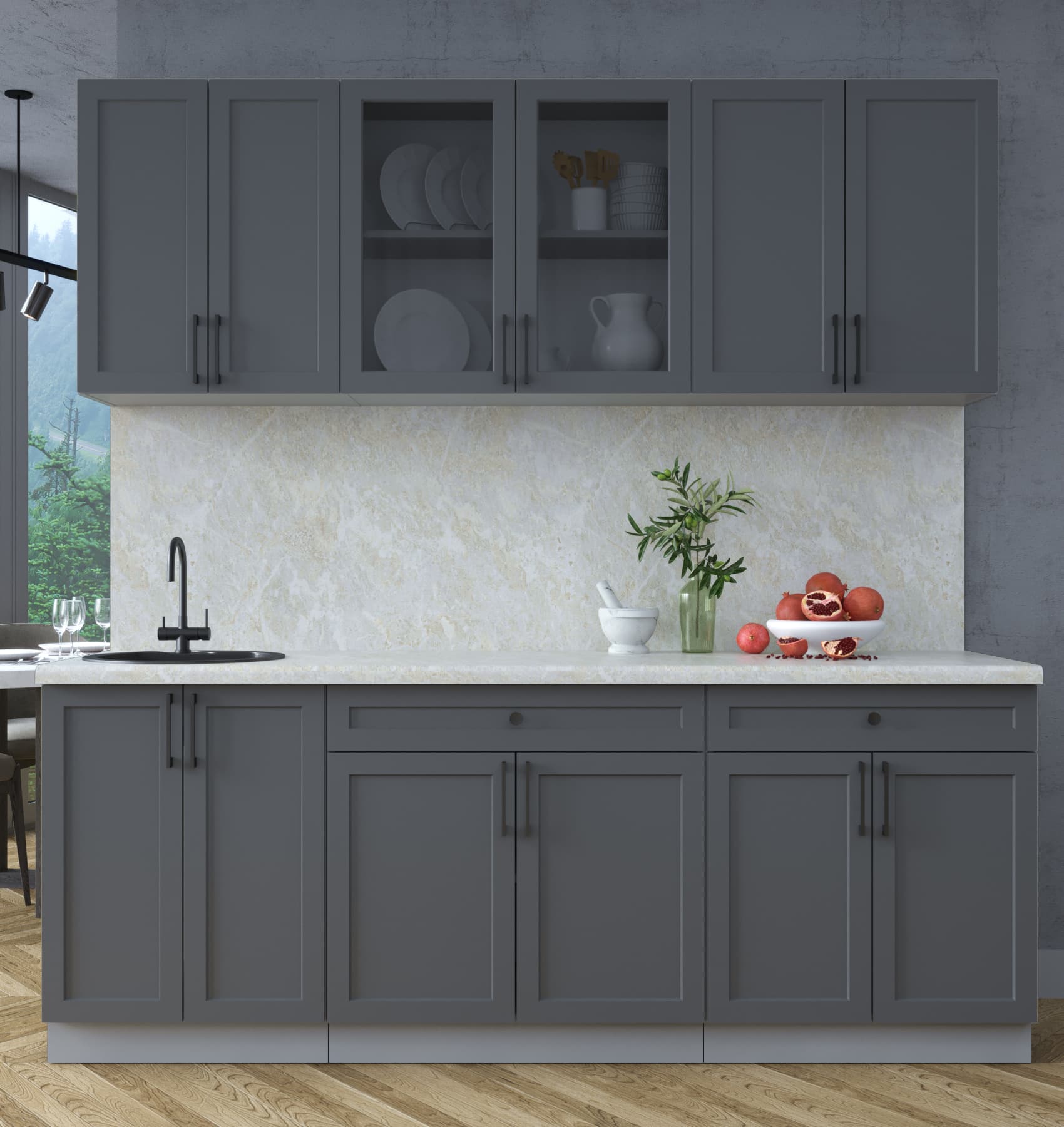 Кухни «Тренд» – отличительной особенностью является фасад с витриной со стеклом «Тонированный графит» и металлические ручки в черном цвете. Максимально актуальное решение для нынешних интерьеров: совокупность практичности, спокойной палитры цветов и элегантного минимализма в фактуре целесообразно как в больших, так и в маленьких помещениях. Принимая решение приоБеларусьи кухню «Тренд», Вы совершаете выбор в пользу лаконичности и функциональности по крайне приятной цене.