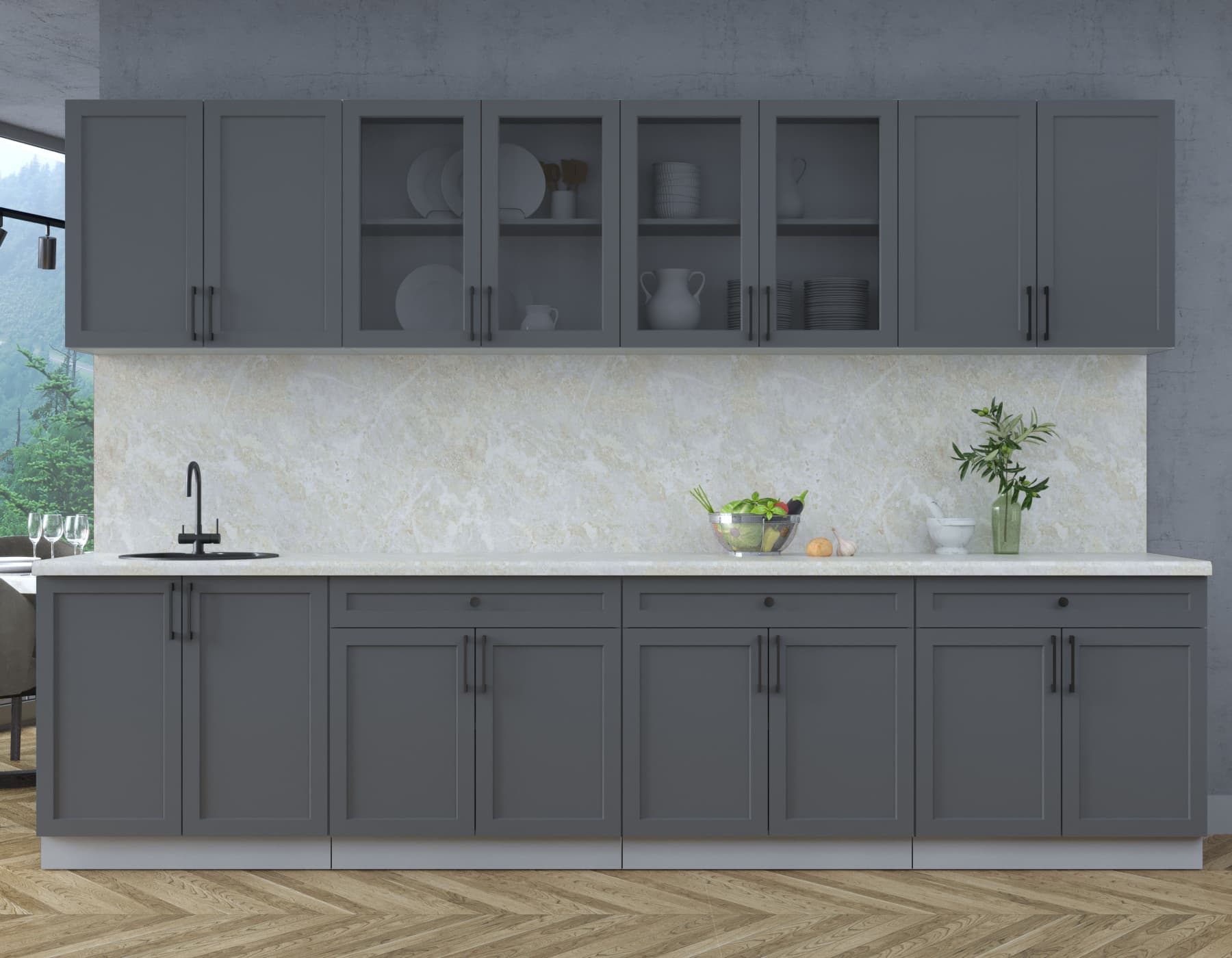 Кухни «Тренд» – отличительной особенностью является фасад с витриной со стеклом «Тонированный графит» и металлические ручки в черном цвете. Максимально актуальное решение для нынешних интерьеров: совокупность практичности, спокойной палитры цветов и элегантного минимализма в фактуре целесообразно как в больших, так и в маленьких помещениях. Принимая решение приоБеларусьи кухню «Тренд», Вы совершаете выбор в пользу лаконичности и функциональности по крайне приятной цене.