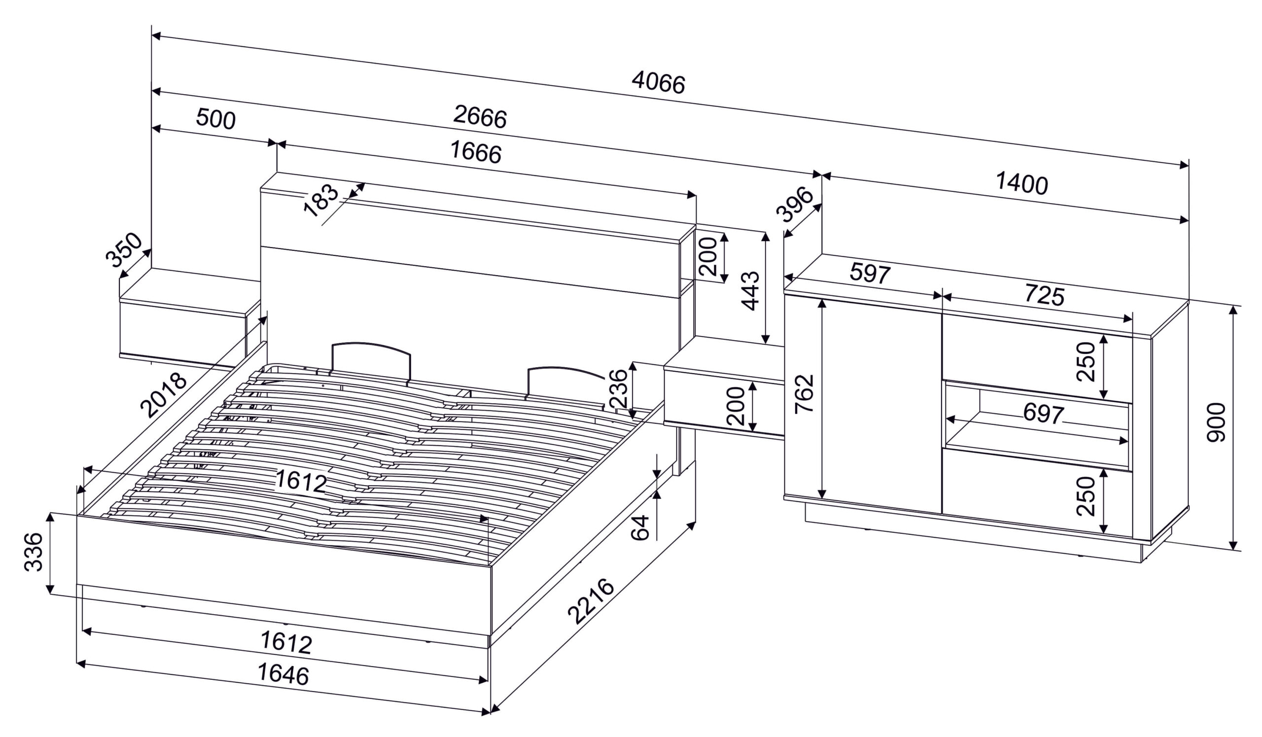 НАБОР МЕБЕЛИ ДЛЯ СПАЛЬНИ QUARTZ-15 Ш4066 В943 Г2216 (БЕЛЫЙ ПЛАТИНУМ/ БЕТОН)