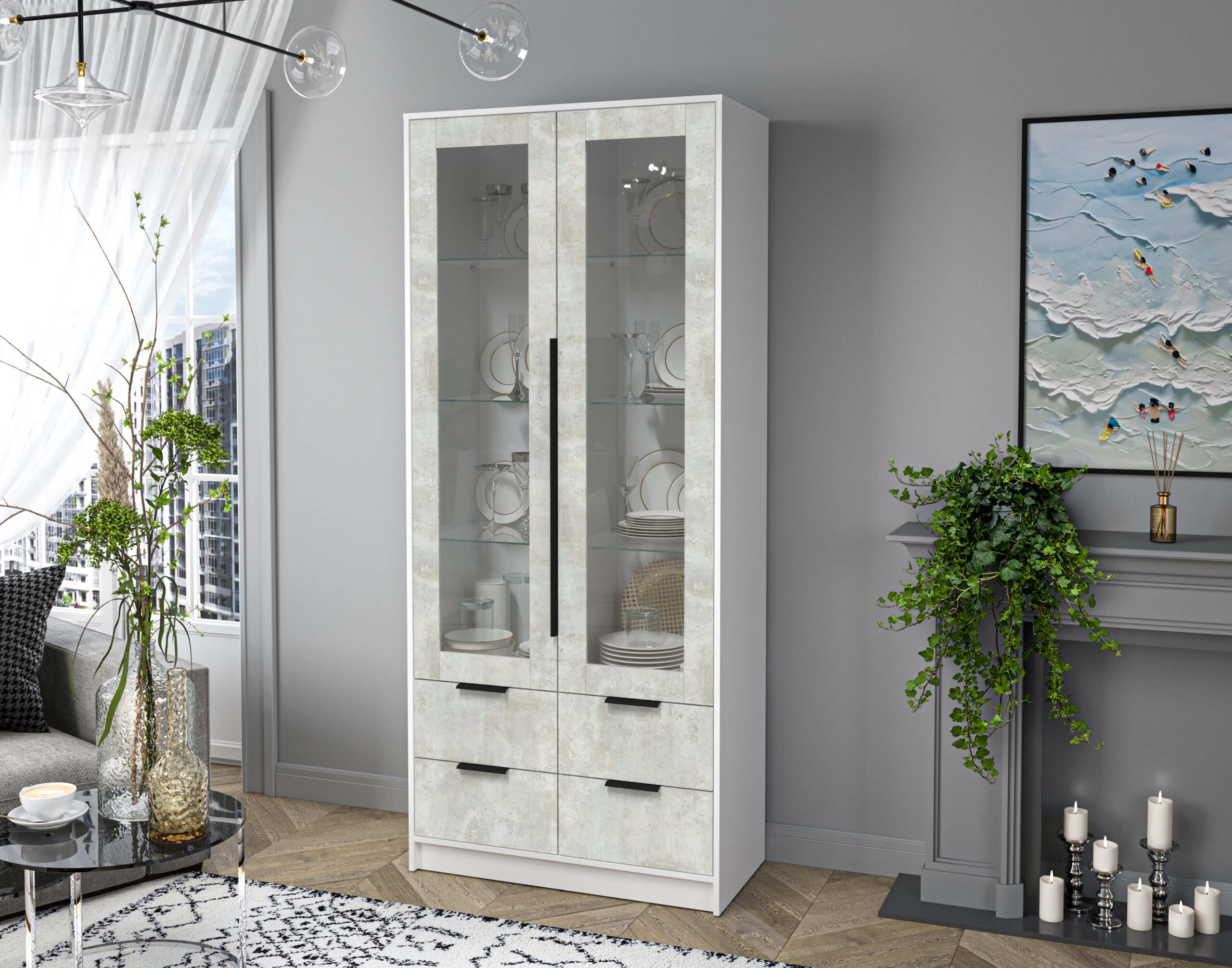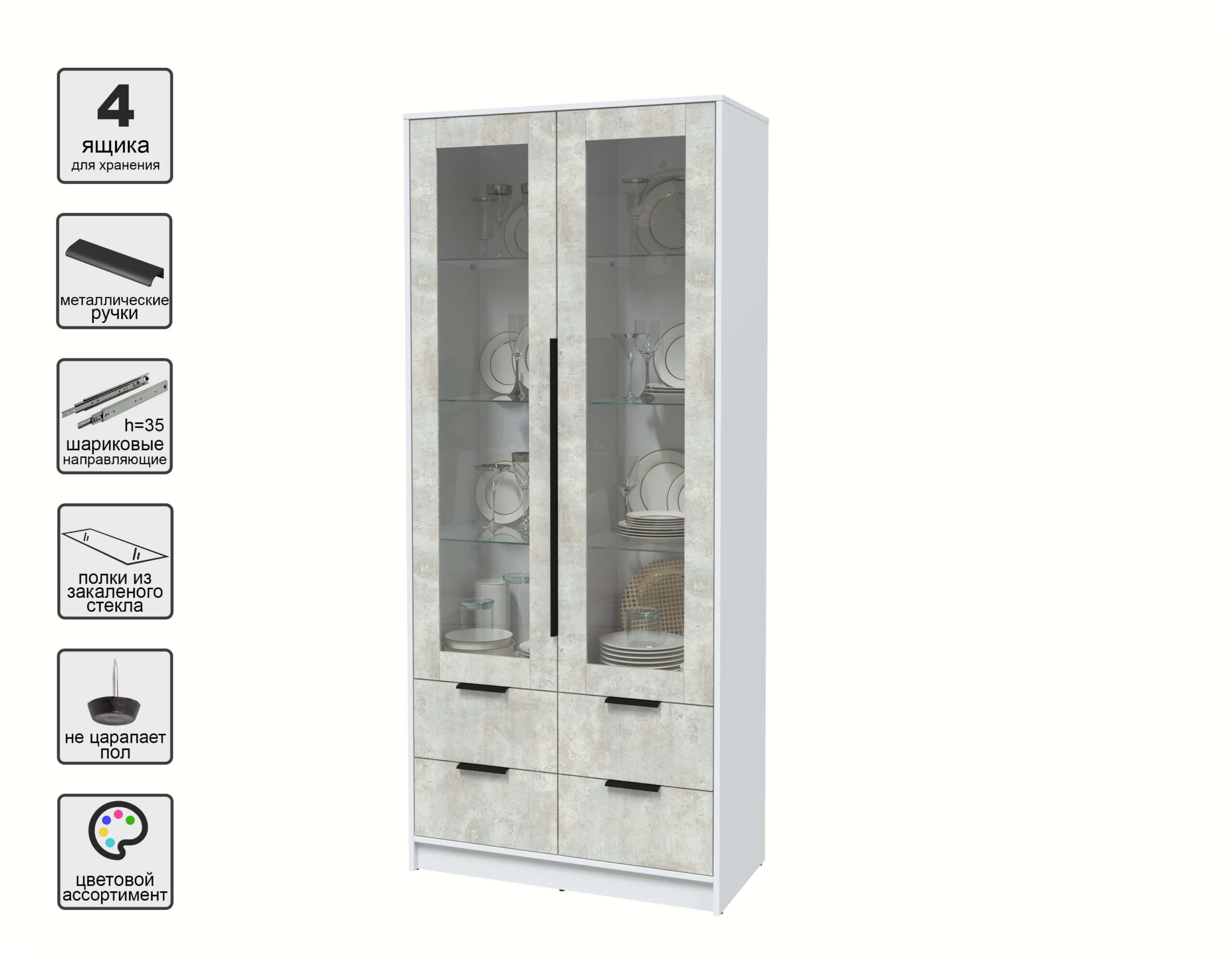 ШКАФ С ВИТРИНОЙ КТ-ШВ2 (БЕЛЫЙ ЛДСП/ БЕТОН ЛАЙТ ЛДСП) Ш918 В2128 Г451 - Yuta.by