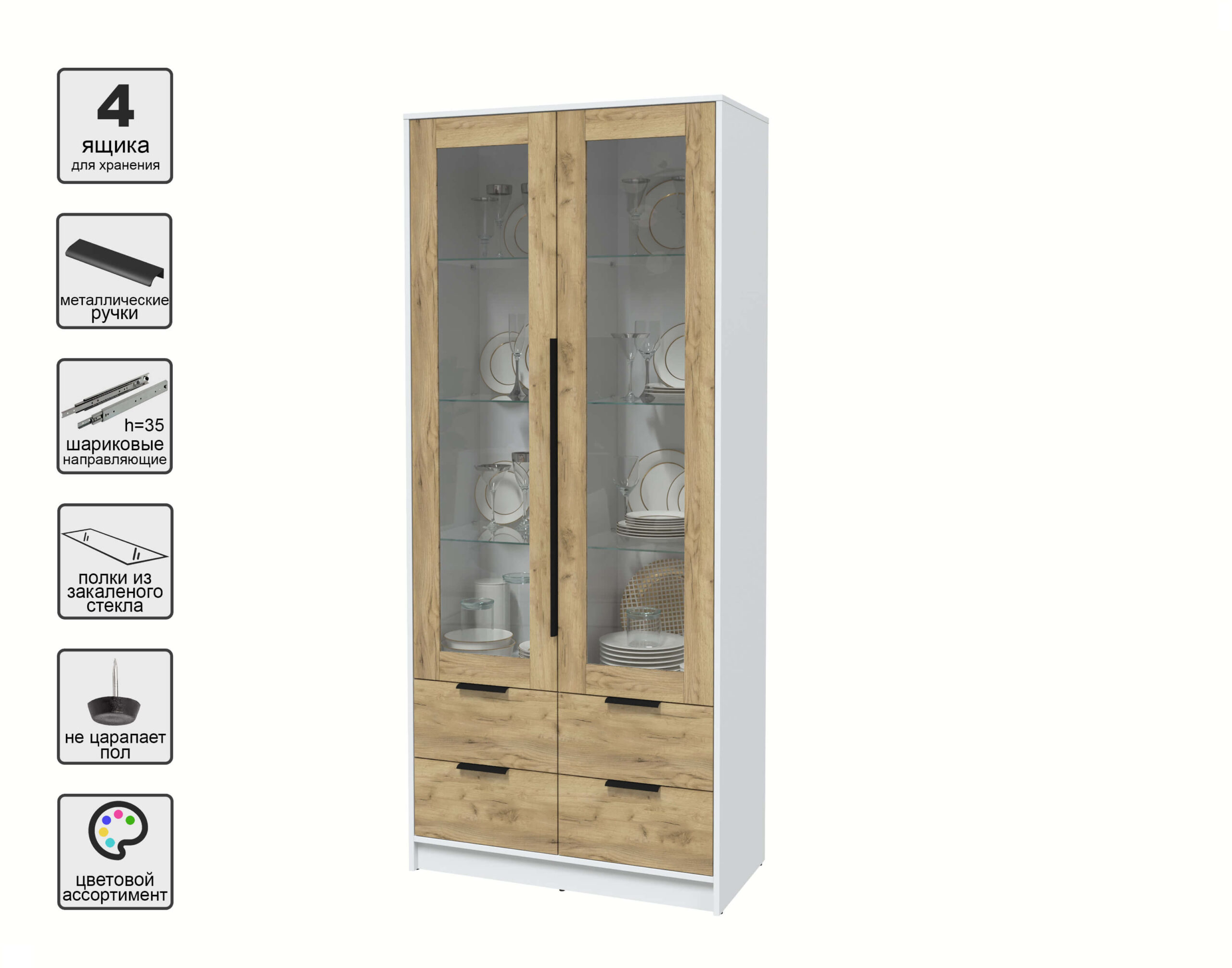 ШКАФ С ВИТРИНОЙ КТ-ШВ2 (БЕЛЫЙ ЛДСП/ ДУБ ЗОЛОТОЙ ЛДСП) Ш918 В2128 Г451