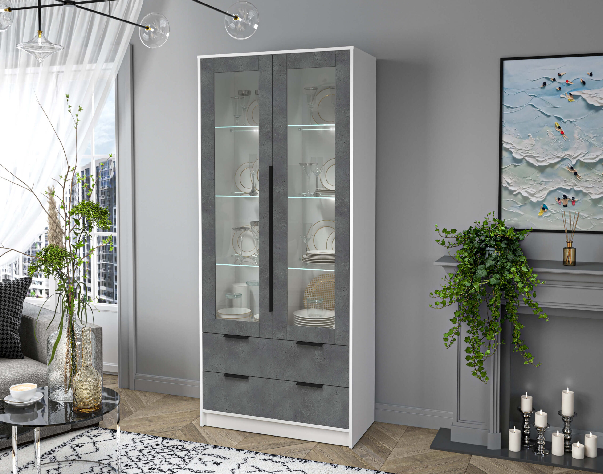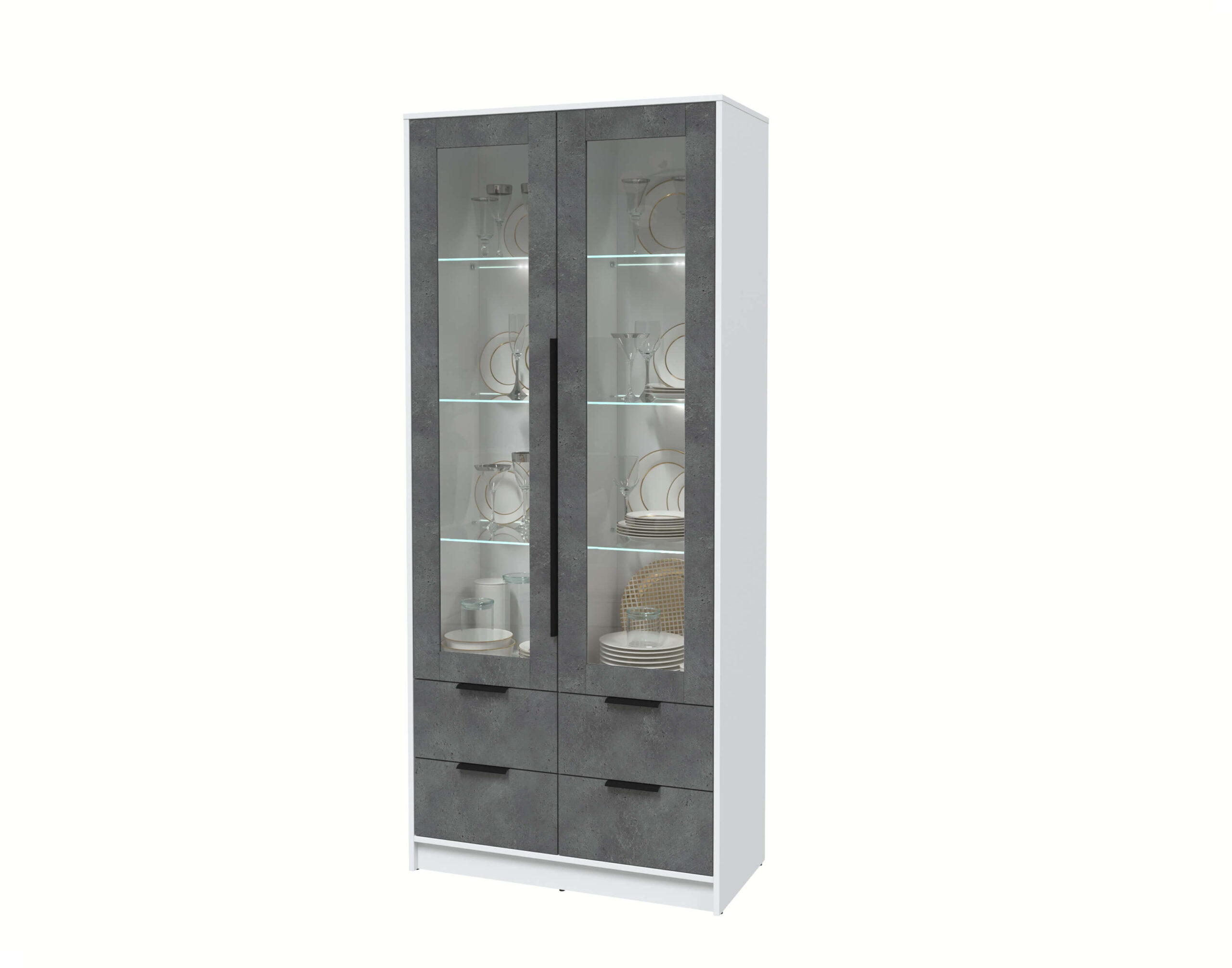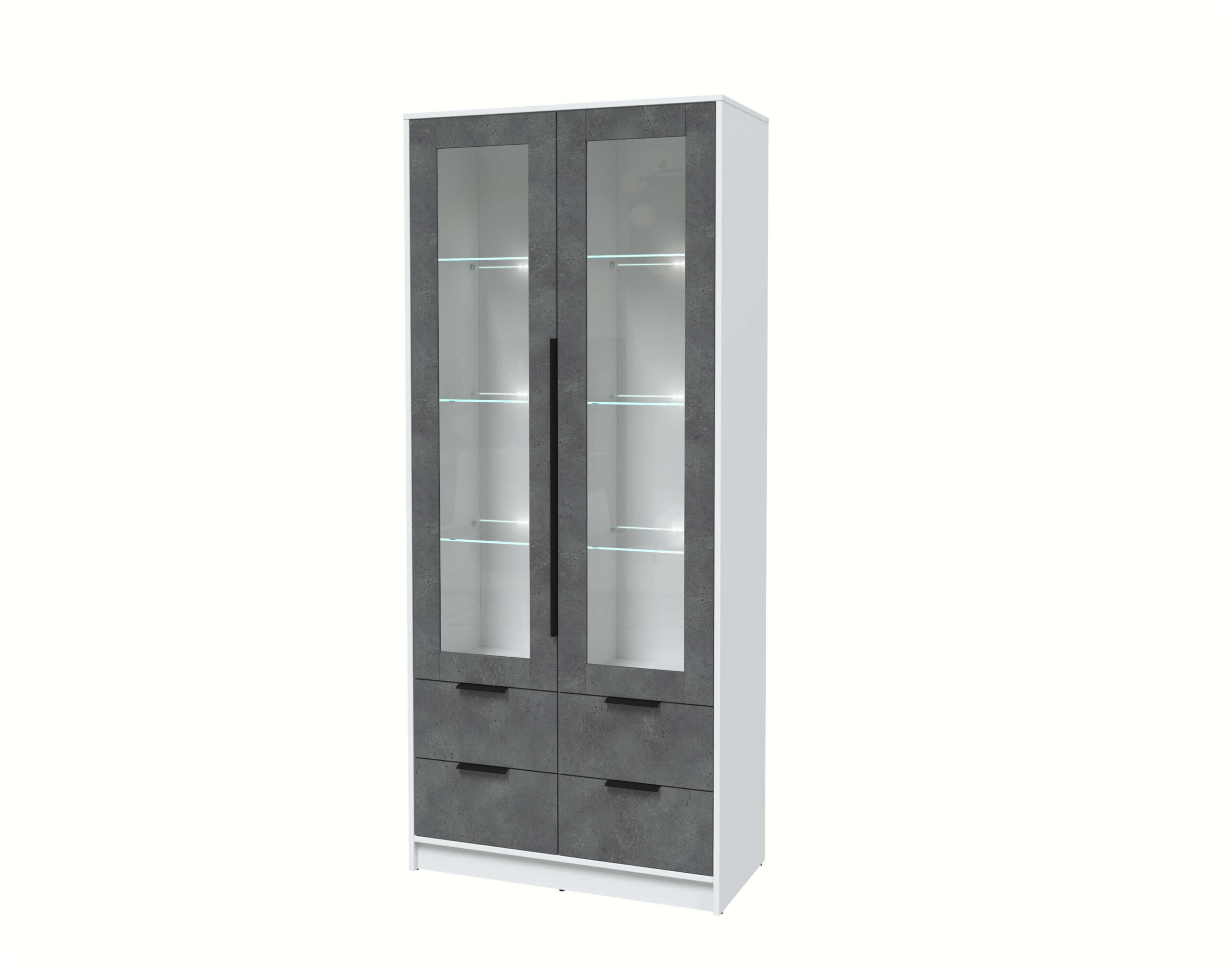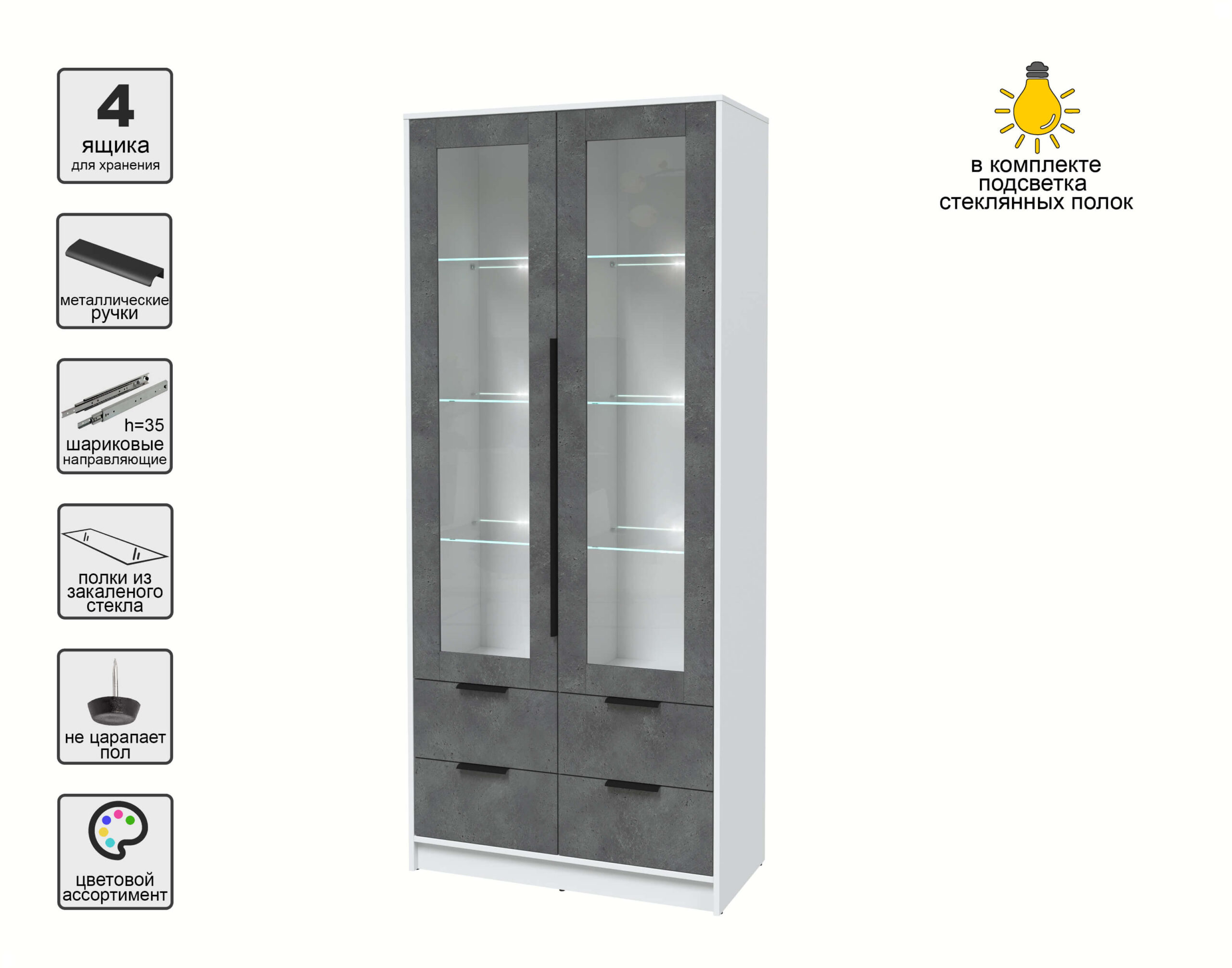 ШКАФ С ВИТРИНОЙ КТ-ШВ2 С ПОДСВЕТКОЙ (БЕЛЫЙ ЛДСП/ БЕТОН ПОРТЛЕНД ЛДСП) Ш918 В2128 Г451 - Yuta.by