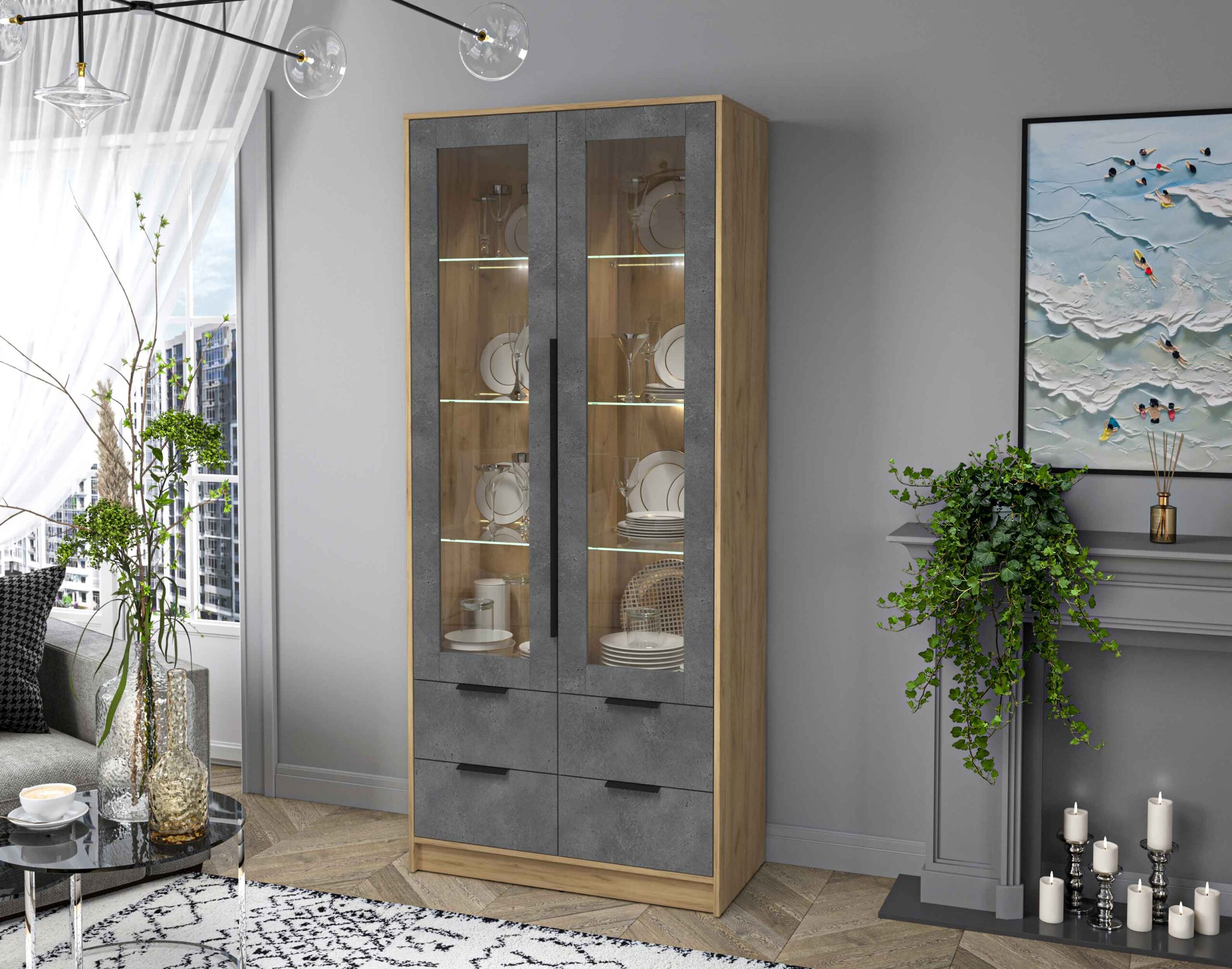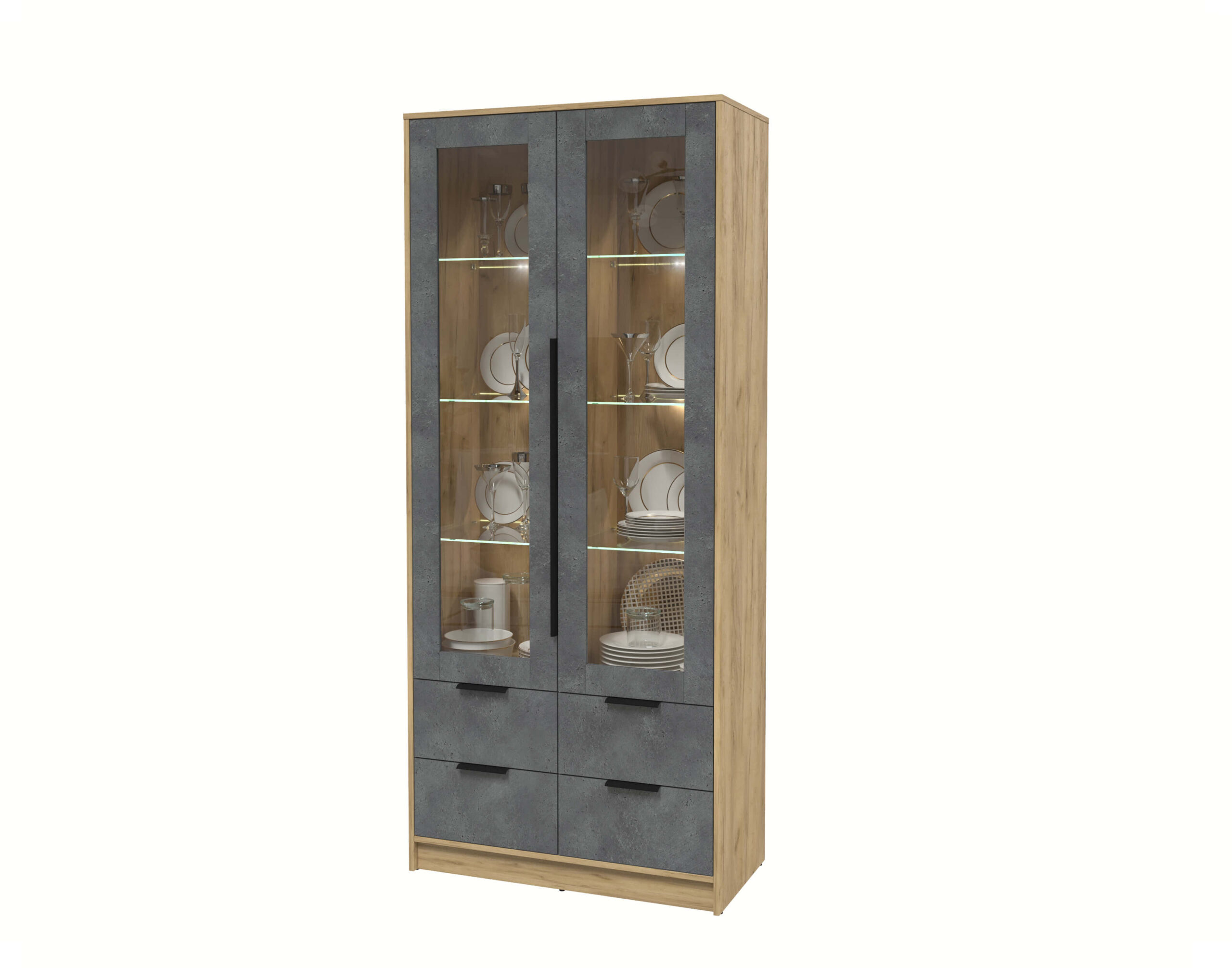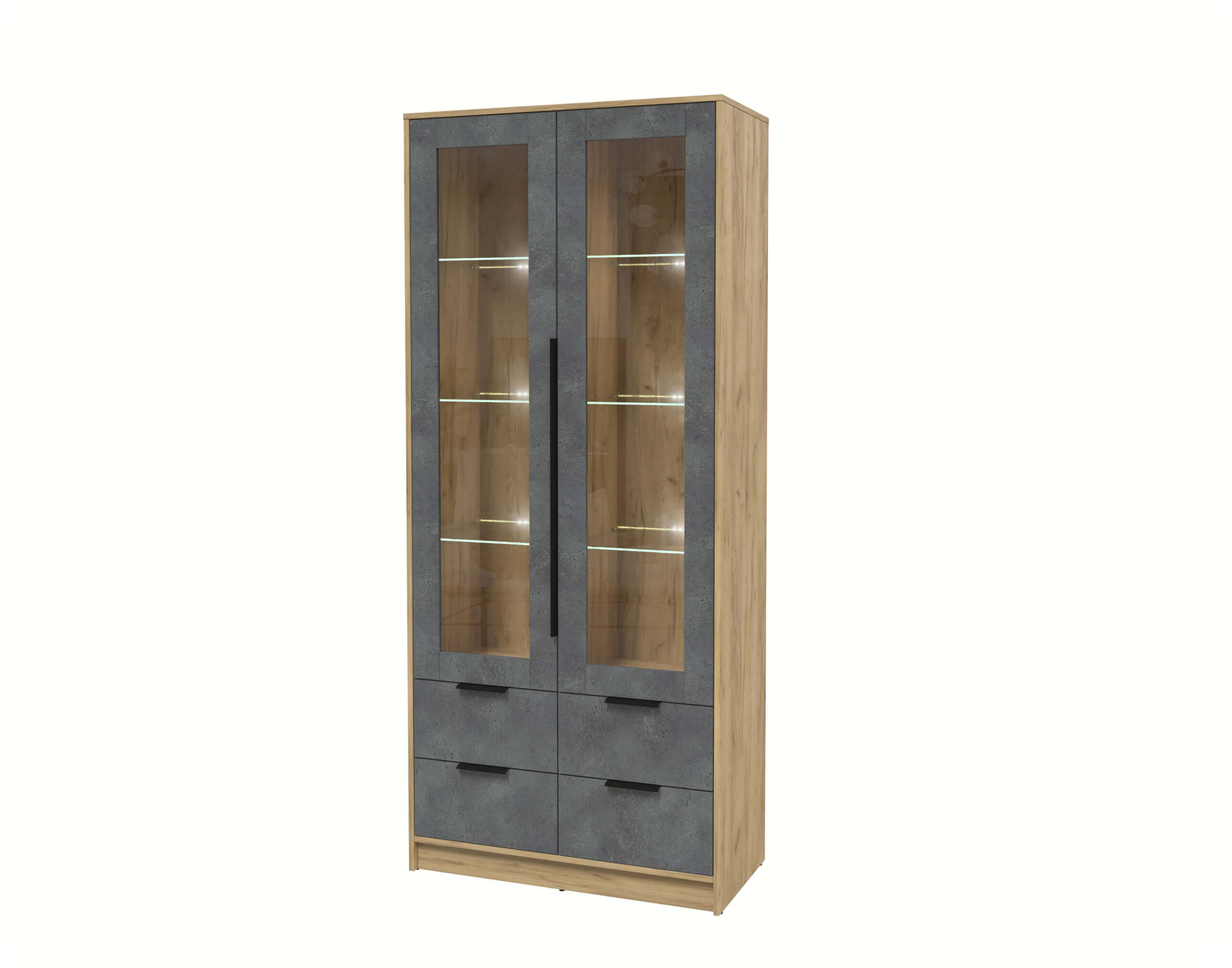 ШКАФ С ВИТРИНОЙ КТ-ШВ2 С ПОДСВЕТКОЙ (ДУБ ЗОЛОТОЙ ЛДСП/ БЕТОН ПОРТЛЕНД ЛДСП) Ш918 В2128 Г451 - Yuta.by