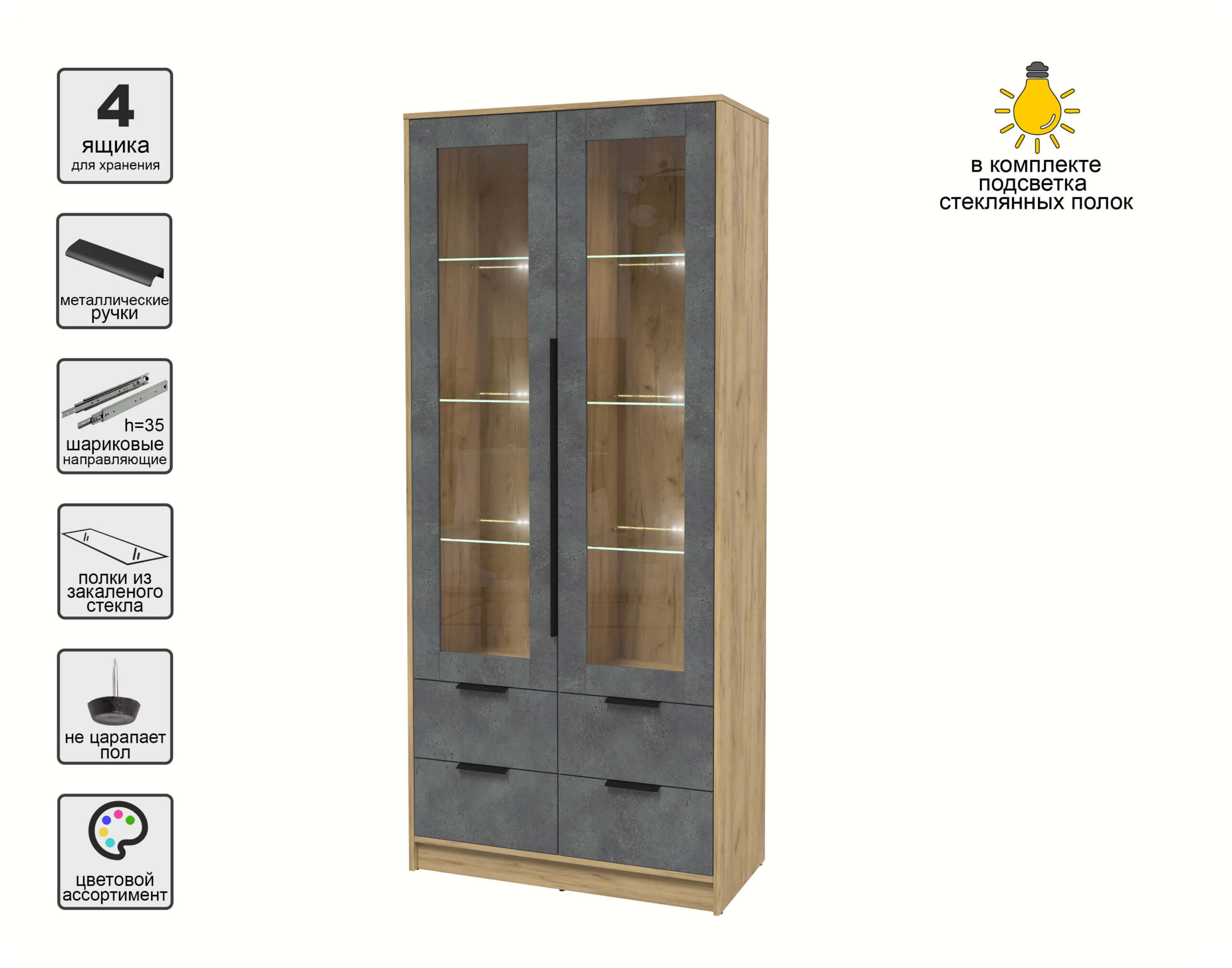 ШКАФ С ВИТРИНОЙ КТ-ШВ2 С ПОДСВЕТКОЙ (ДУБ ЗОЛОТОЙ ЛДСП/ БЕТОН ПОРТЛЕНД ЛДСП) Ш918 В2128 Г451