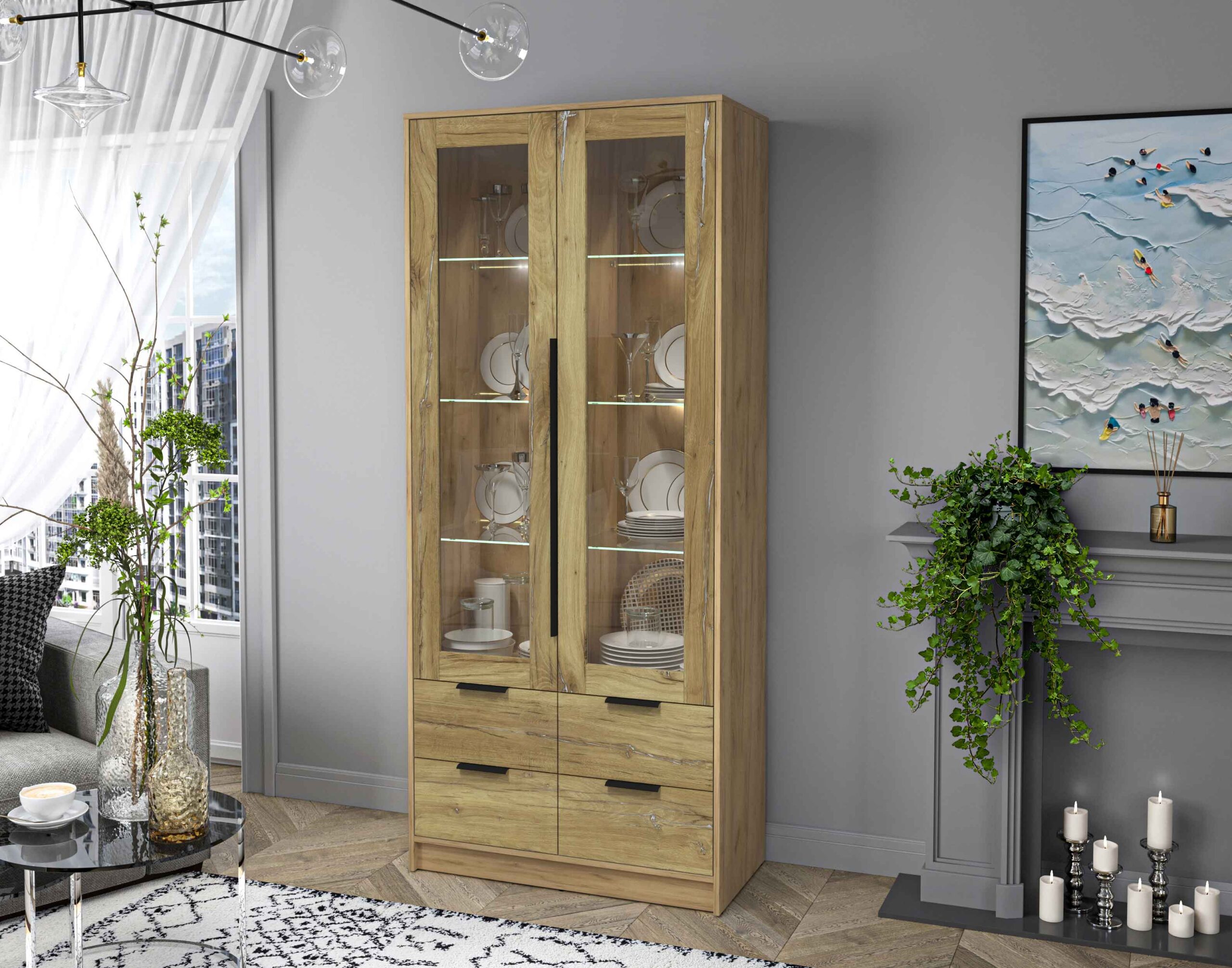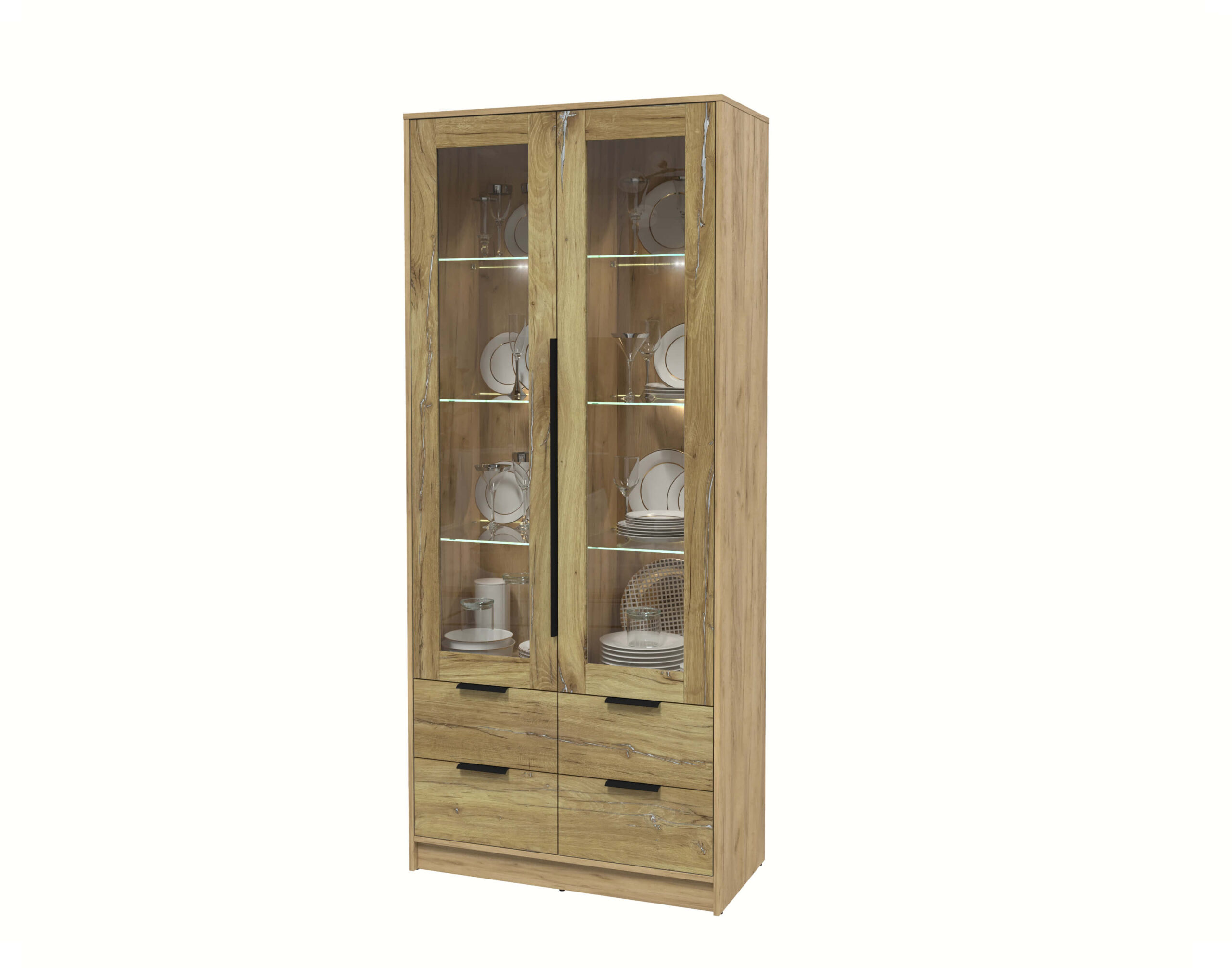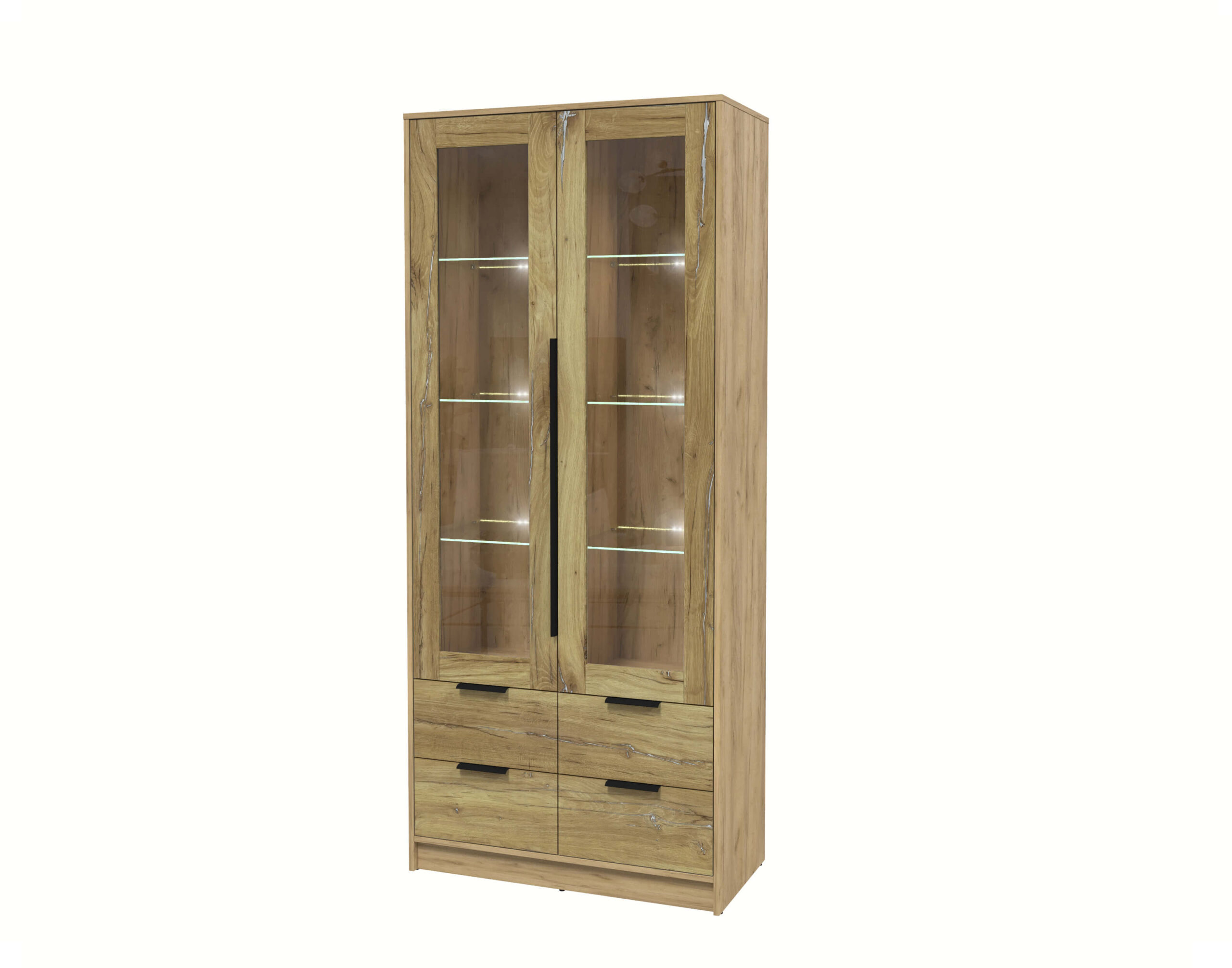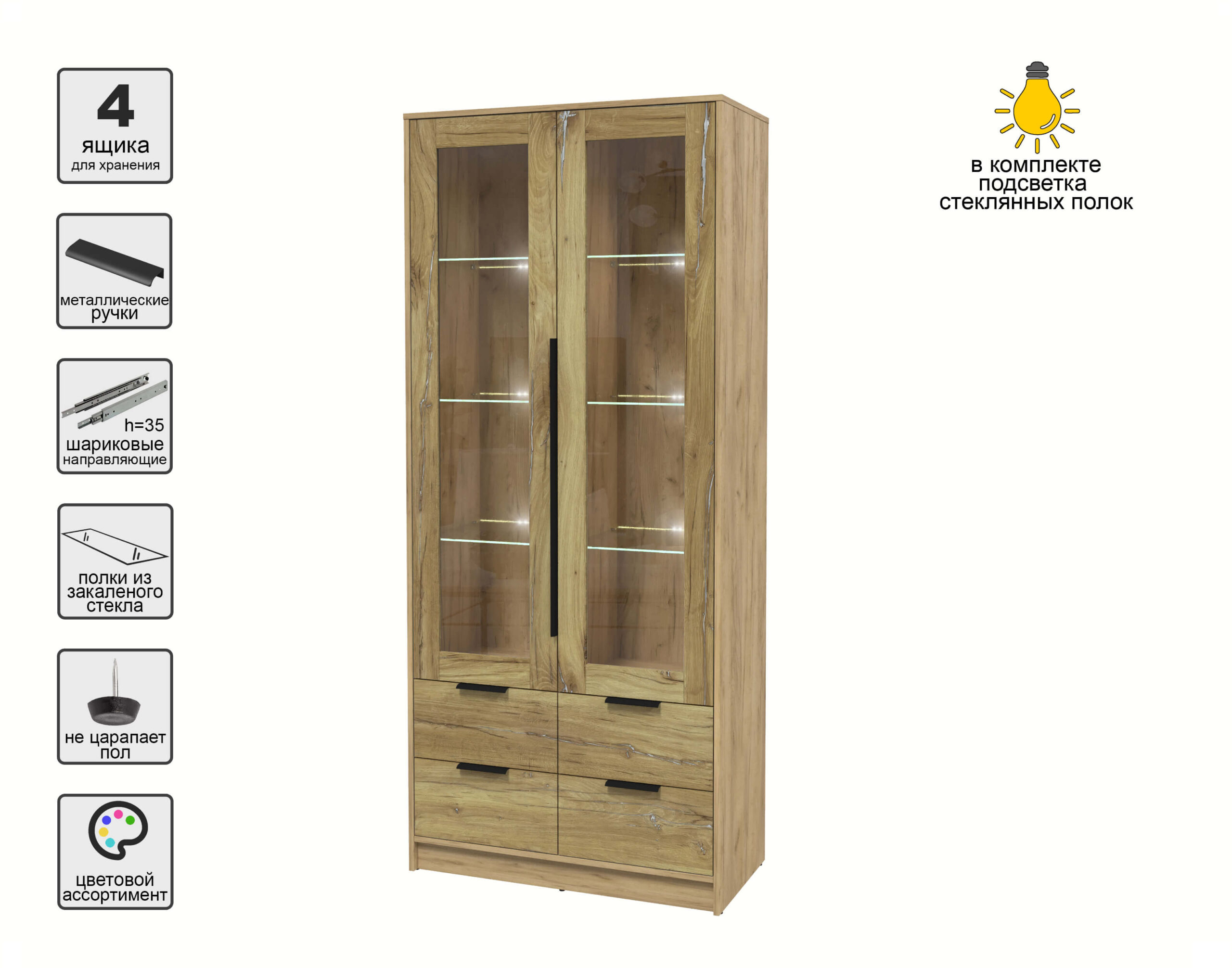 ШКАФ С ВИТРИНОЙ КТ-ШВ2 С ПОДСВЕТКОЙ (ДУБ ЗОЛОТОЙ ЛДСП/ ДУБ НОКС ЛДСП) Ш918 В2128 Г451 - Yuta.by