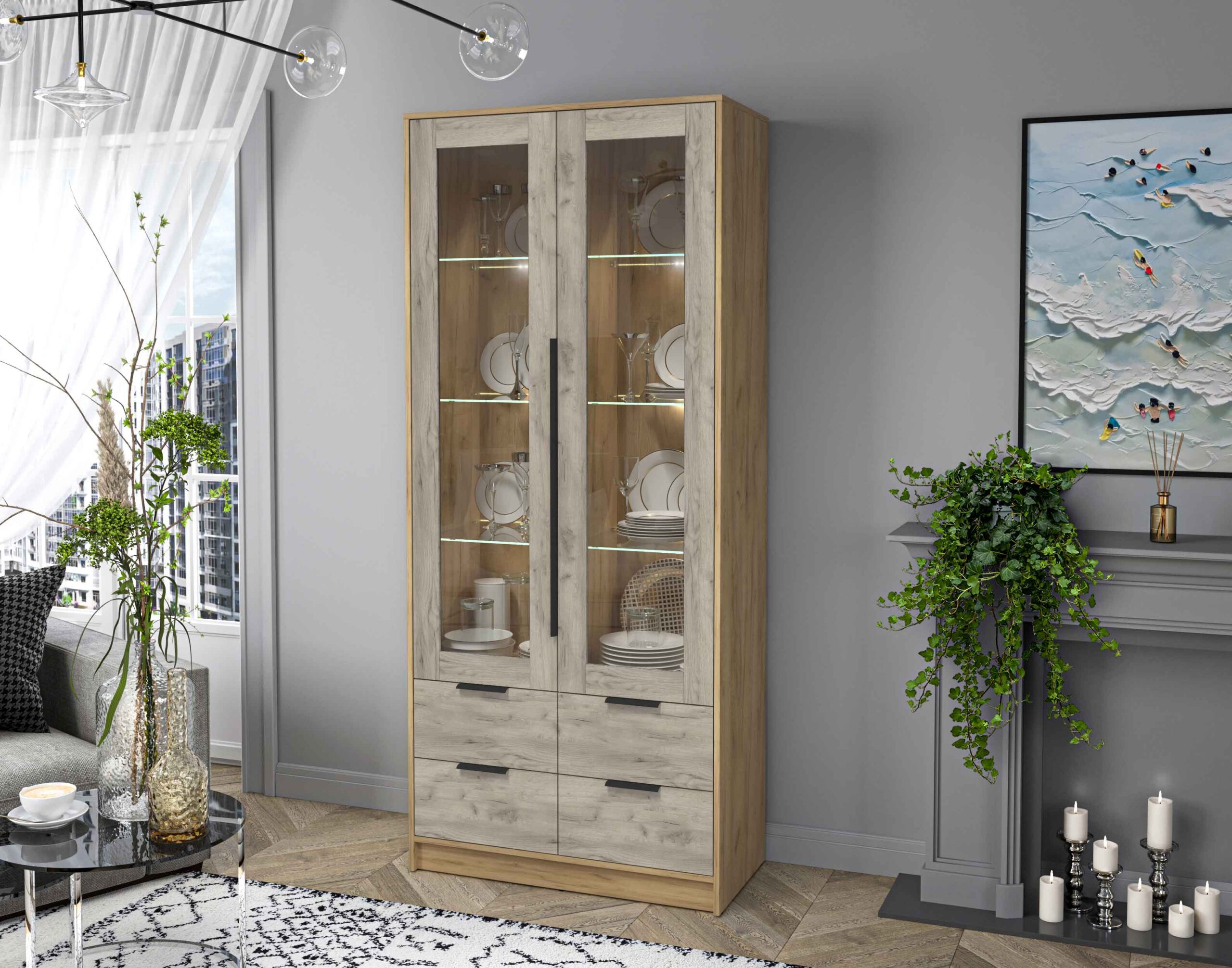 ШКАФ С ВИТРИНОЙ КТ-ШВ2 С ПОДСВЕТКОЙ (ДУБ ЗОЛОТОЙ ЛДСП/ ДУБ СЕРЫЙ ЛДСП) Ш918 В2128 Г451 - Yuta.by