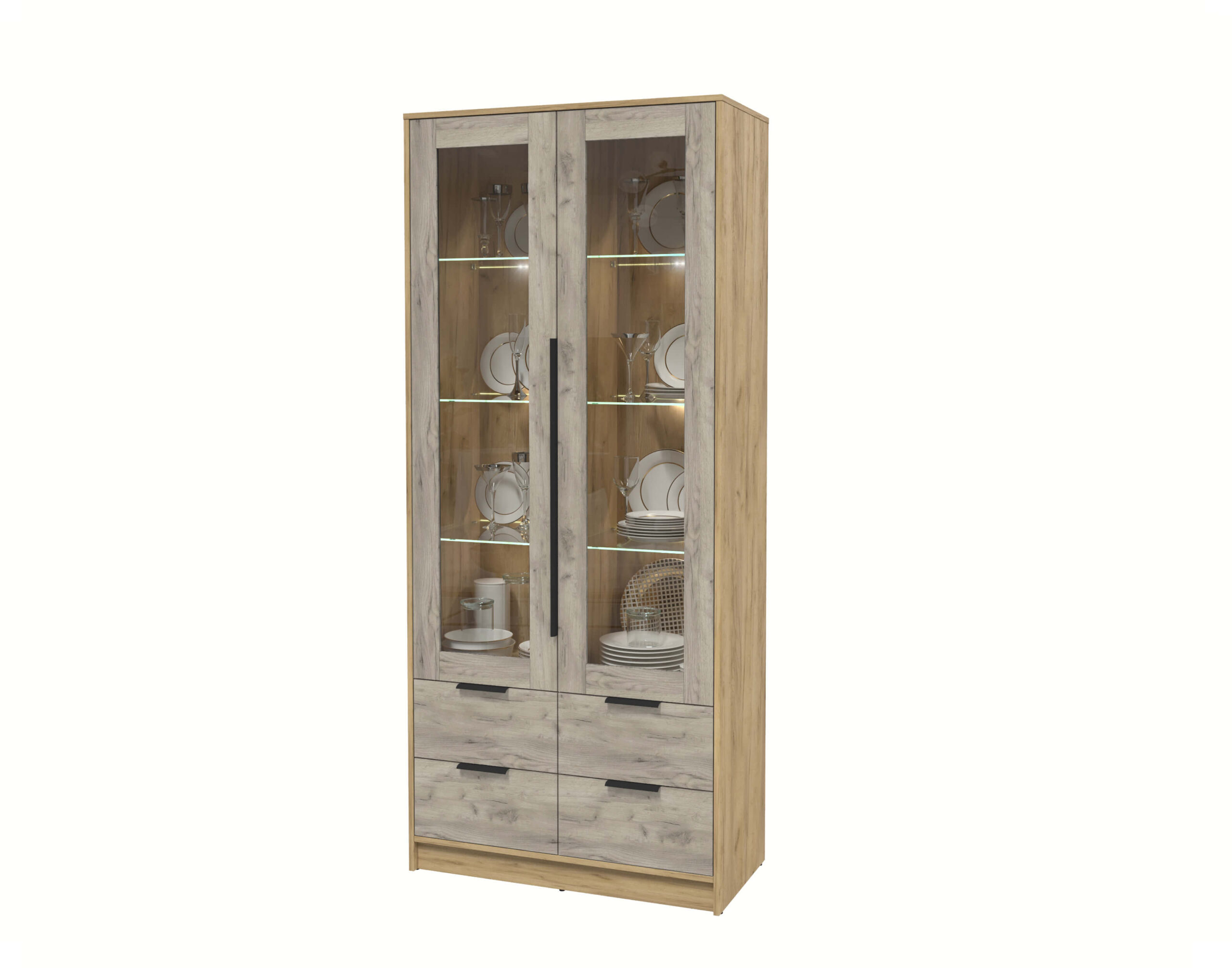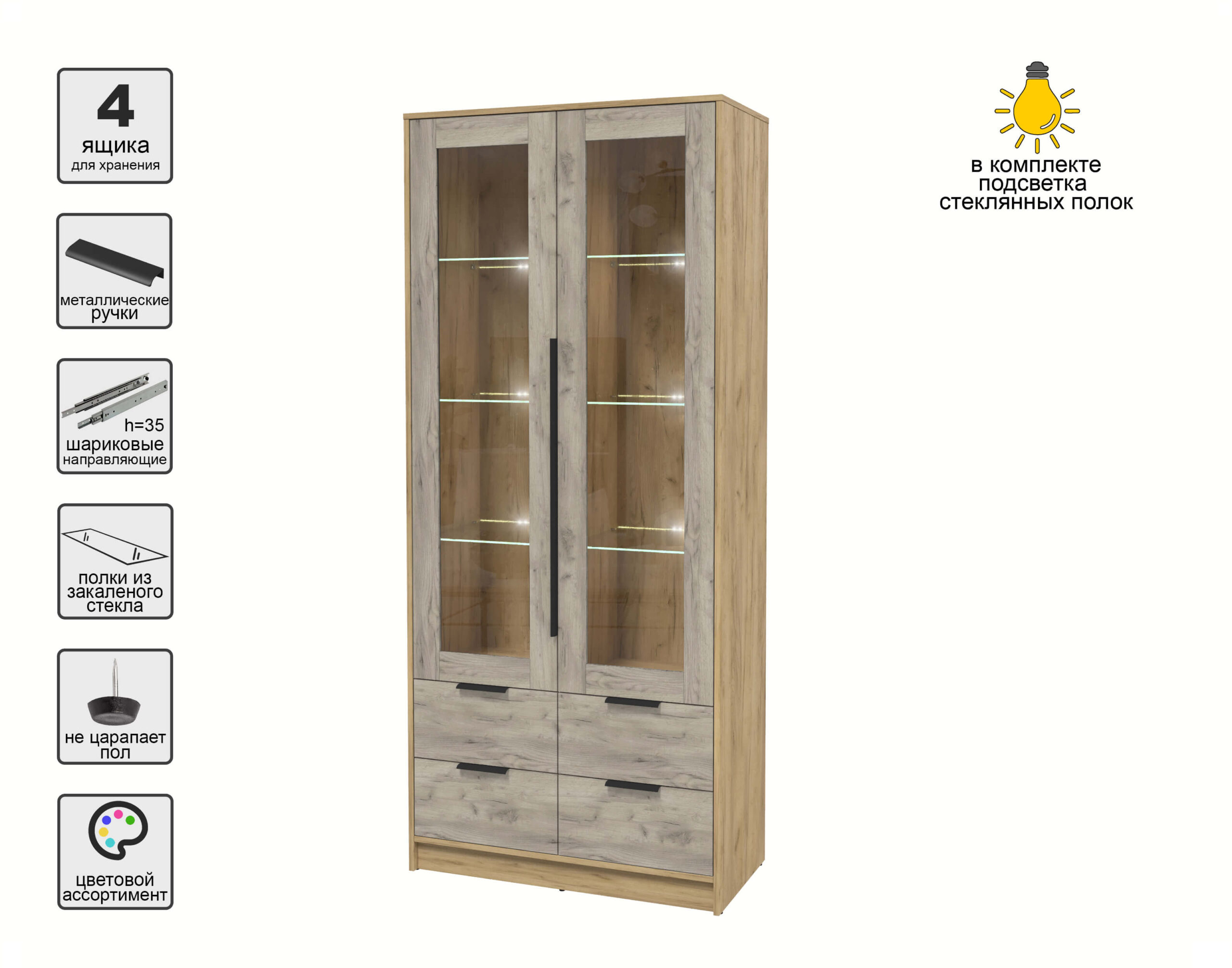 ШКАФ С ВИТРИНОЙ КТ-ШВ2 С ПОДСВЕТКОЙ (ДУБ ЗОЛОТОЙ ЛДСП/ ДУБ СЕРЫЙ ЛДСП) Ш918 В2128 Г451