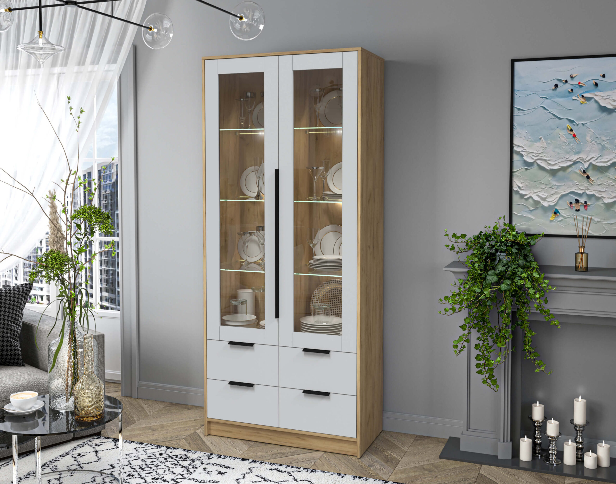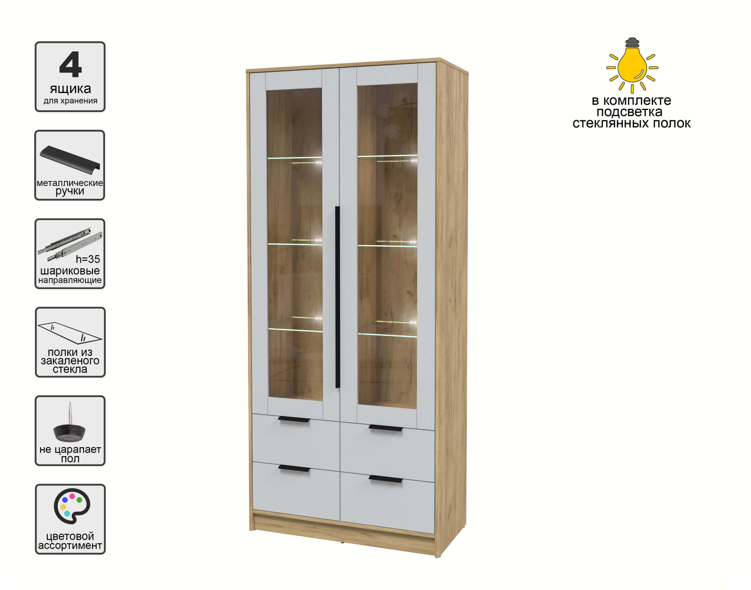 ШКАФ С ВИТРИНОЙ КТ-ШВ2 С ПОДСВЕТКОЙ (ДУБ ЗОЛОТОЙ ЛДСП/ СЕРЫЙ ЛДСП) Ш918 В2128 Г451 - Yuta.by