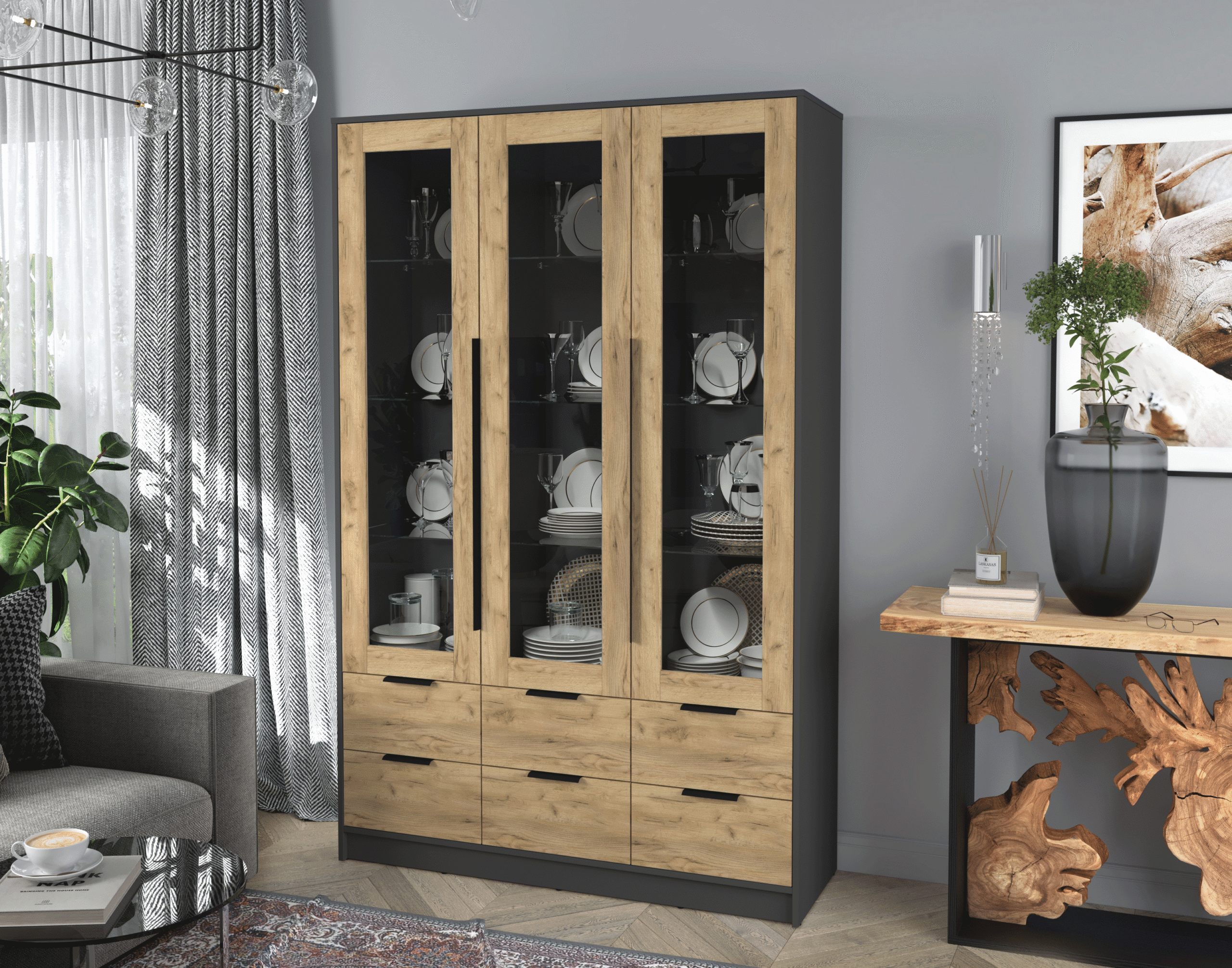 ШКАФ С ВИТРИНОЙ КТ-ШВ3 (АНТРАЦИТ ЛДСП/ ДУБ ЗОЛОТОЙ ЛДСП) Ш1360 В2128 Г451 - Yuta.by