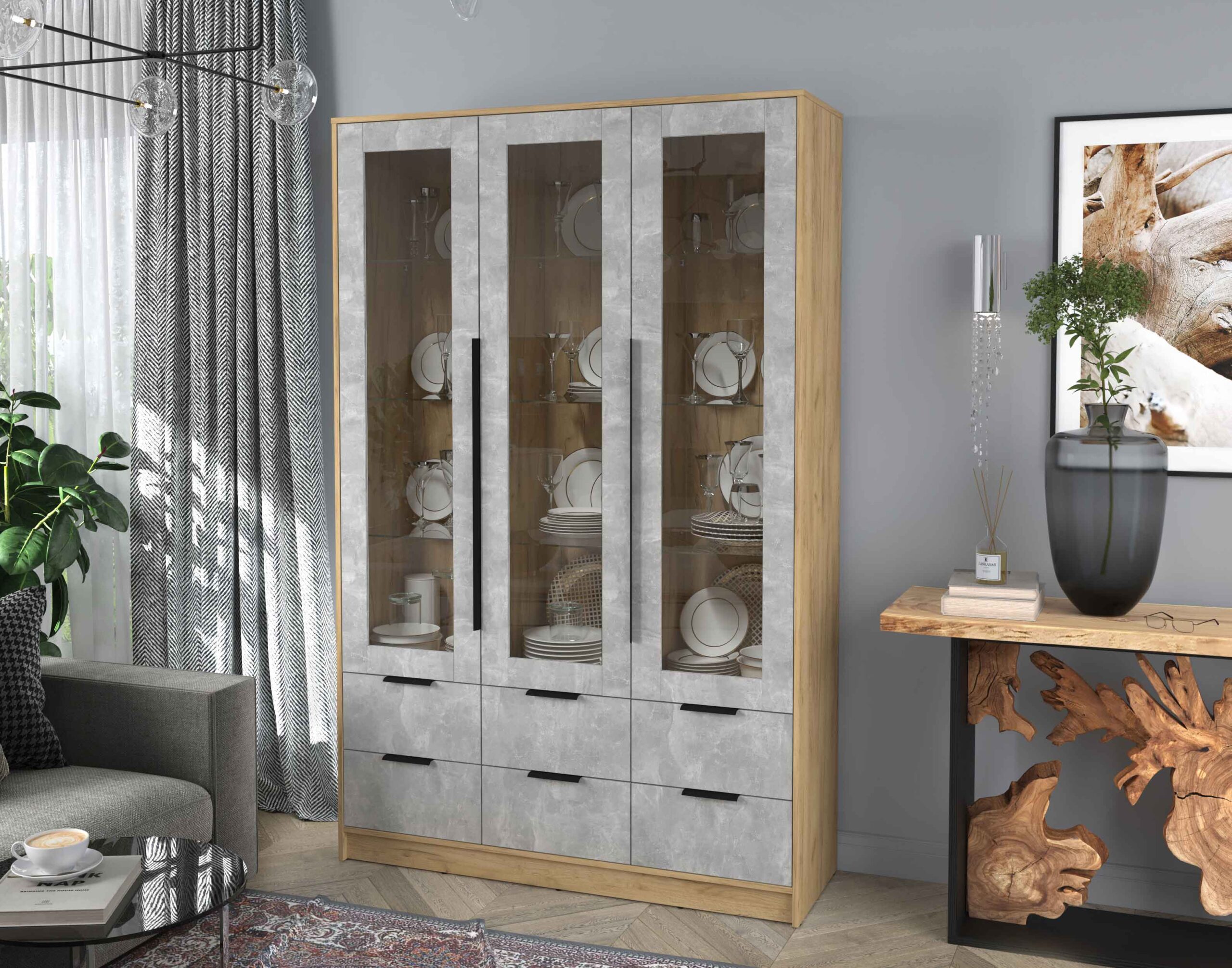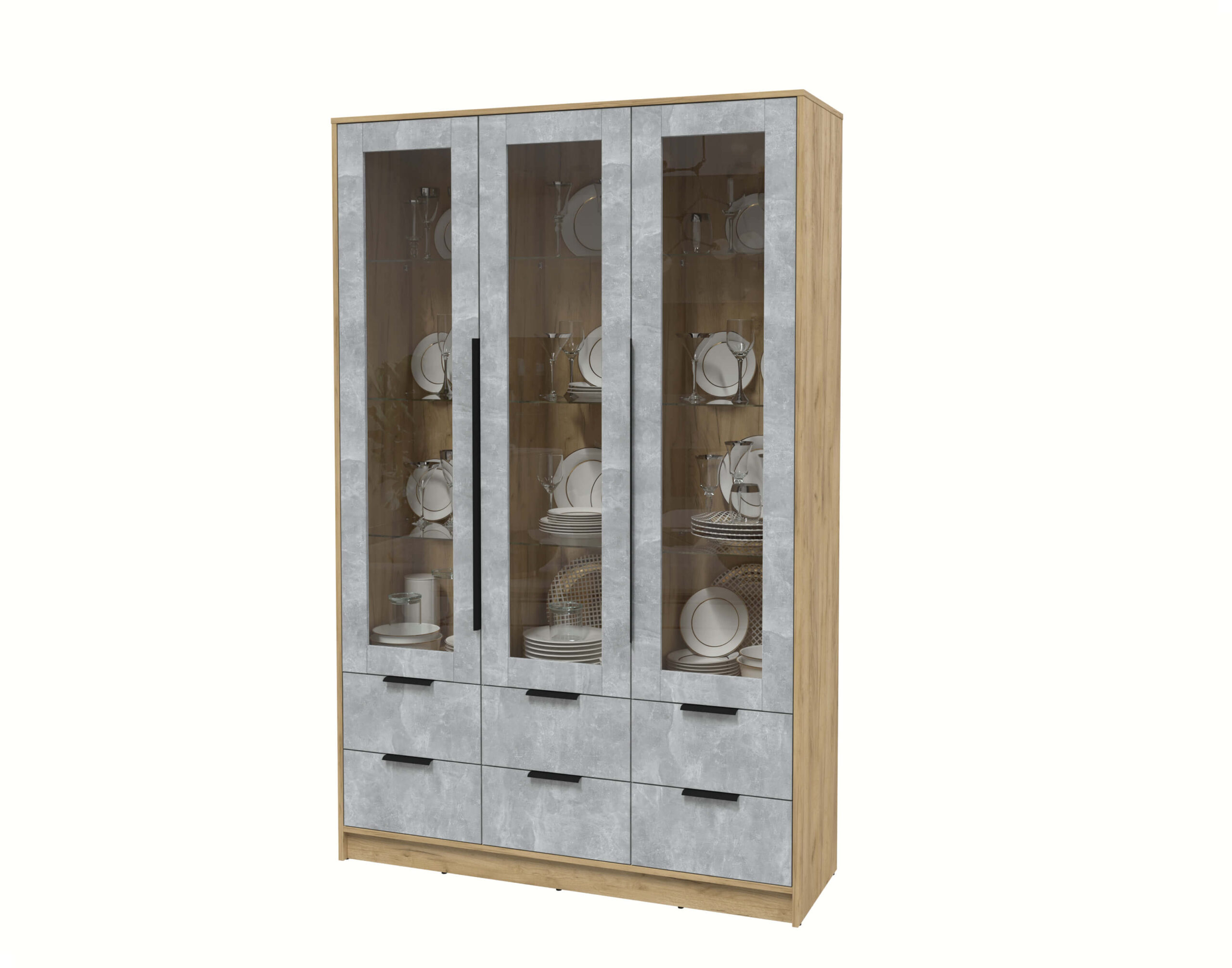 ШКАФ С ВИТРИНОЙ КТ-ШВ3 (ДУБ ЗОЛОТОЙ ЛДСП/ БЕТОН ЛДСП) Ш1360 В2128 Г451