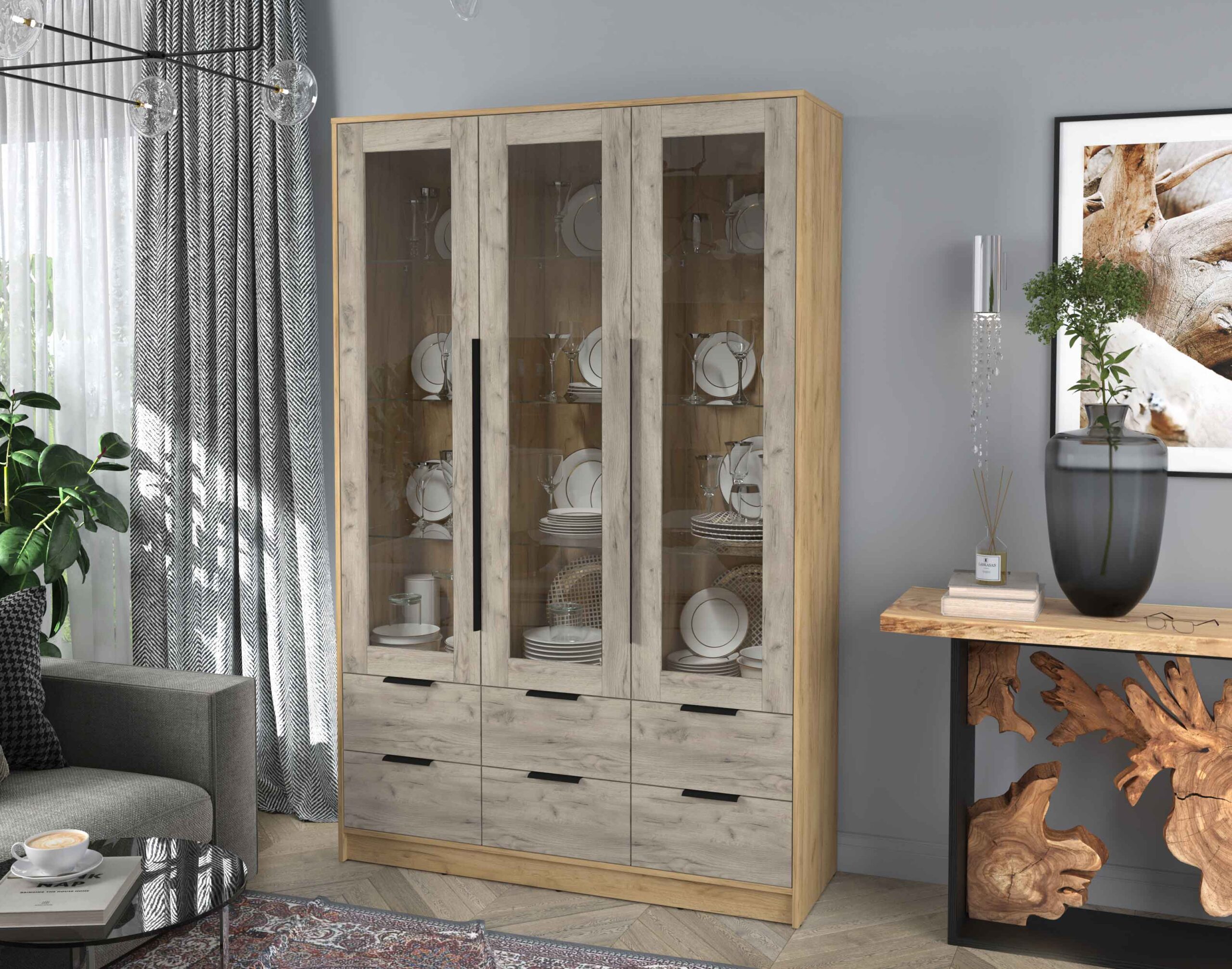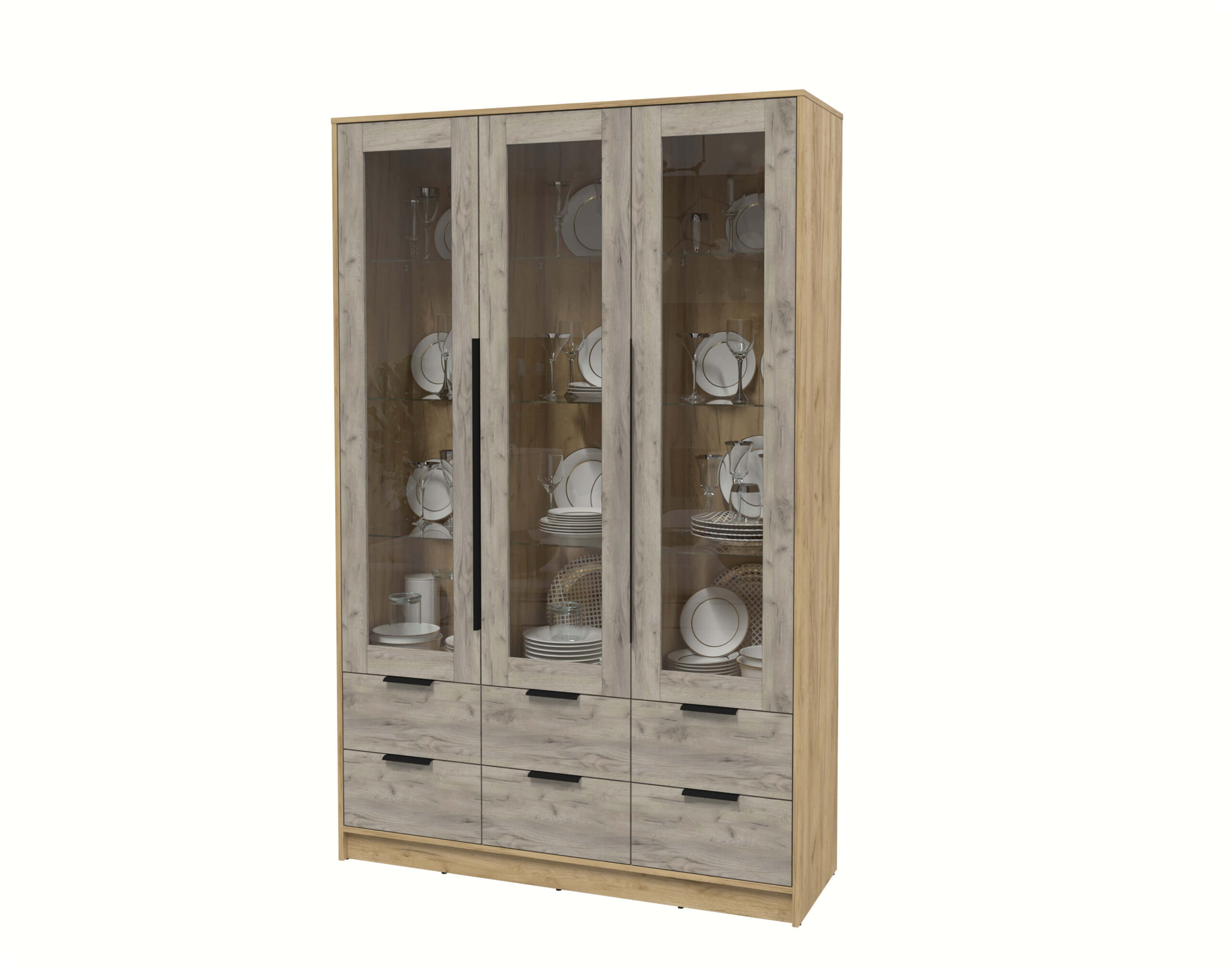 ШКАФ С ВИТРИНОЙ КТ-ШВ3 (ДУБ ЗОЛОТОЙ ЛДСП/ ДУБ СЕРЫЙ ЛДСП) Ш1360 В2128 Г451 - Yuta.by