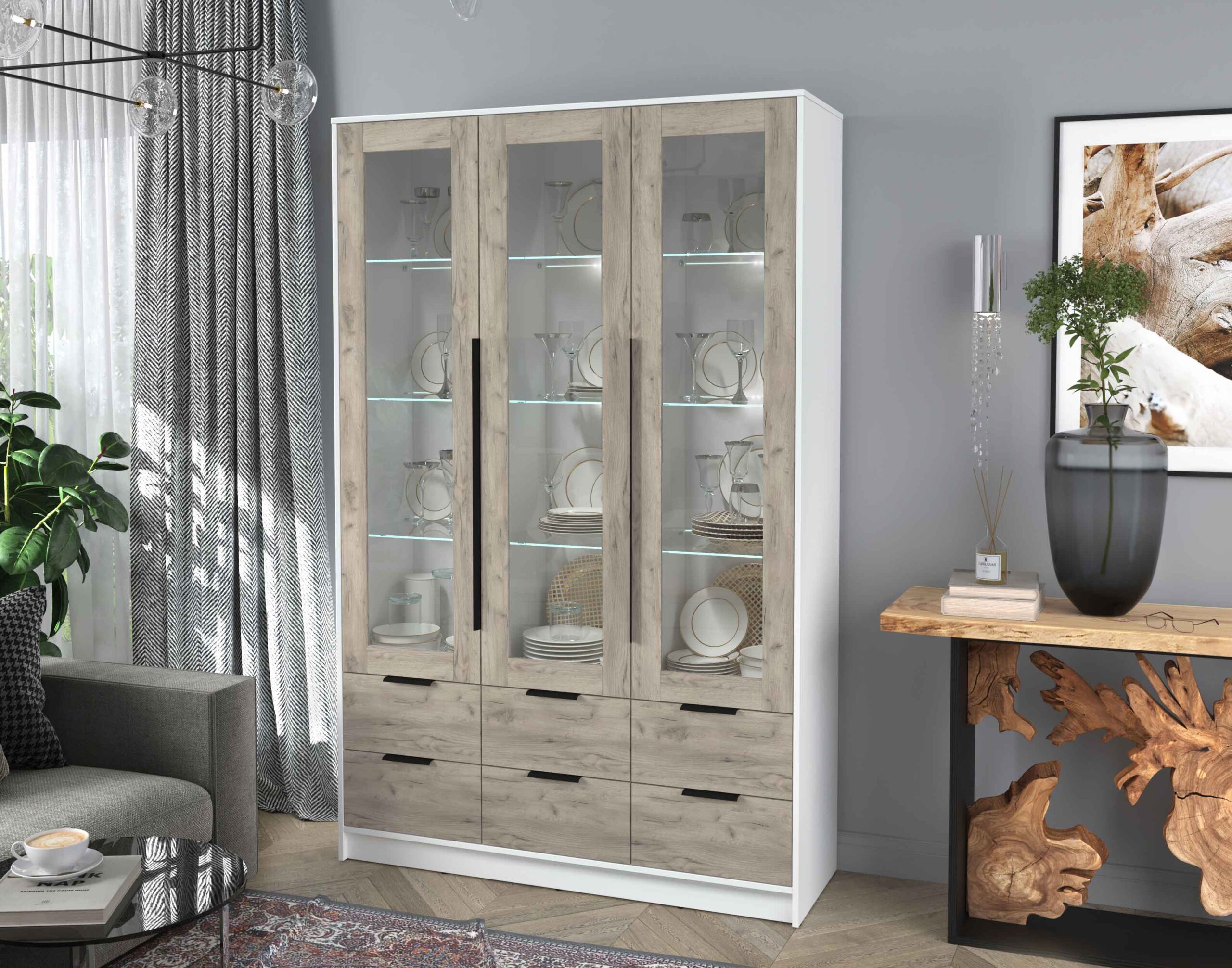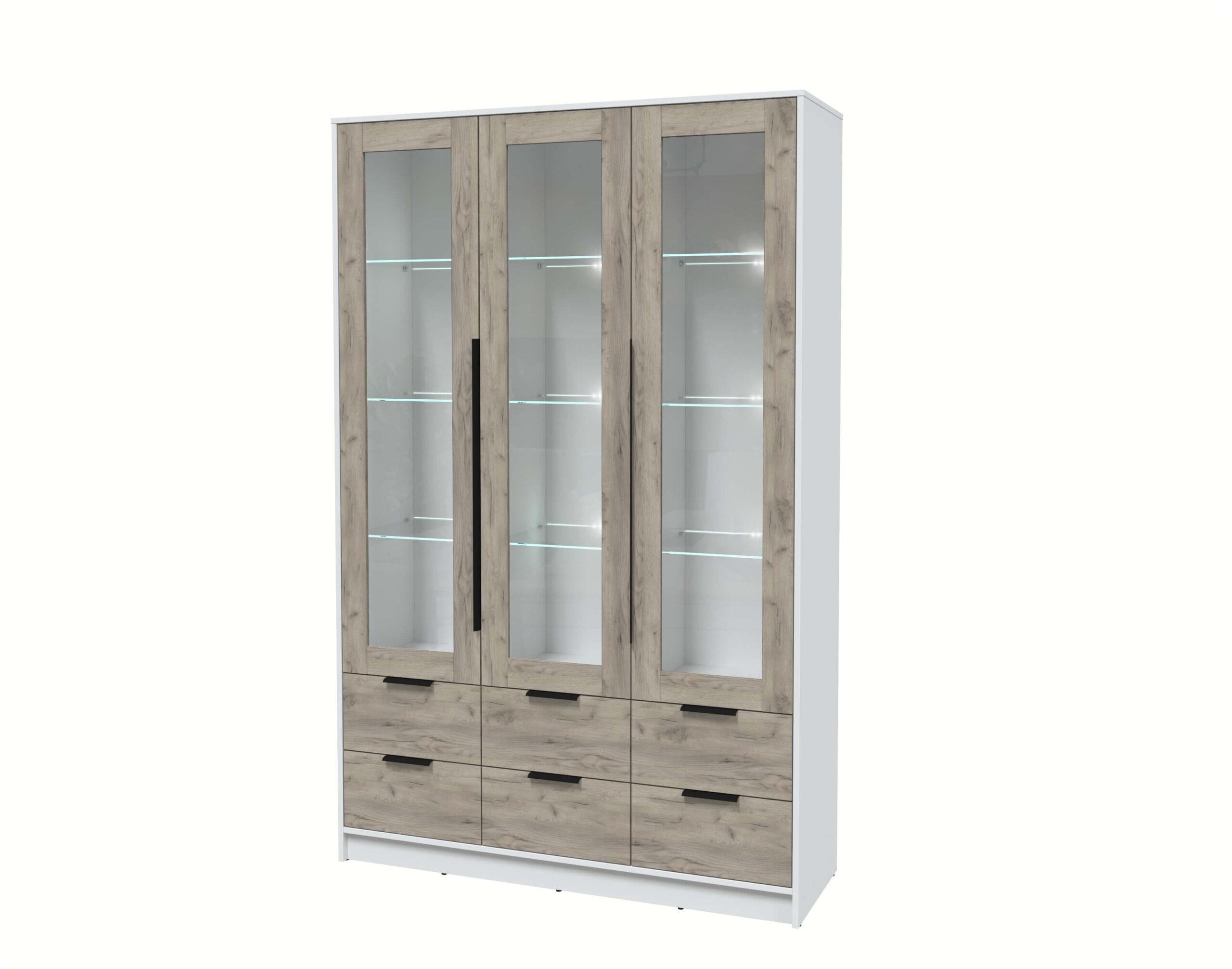 ШКАФ С ВИТРИНОЙ КТ-ШВ3 С ПОДСВЕТКОЙ (БЕЛЫЙ ЛДСП/ ДУБ СЕРЫЙ ЛДСП) Ш1360 В2128 Г451 - Yuta.by