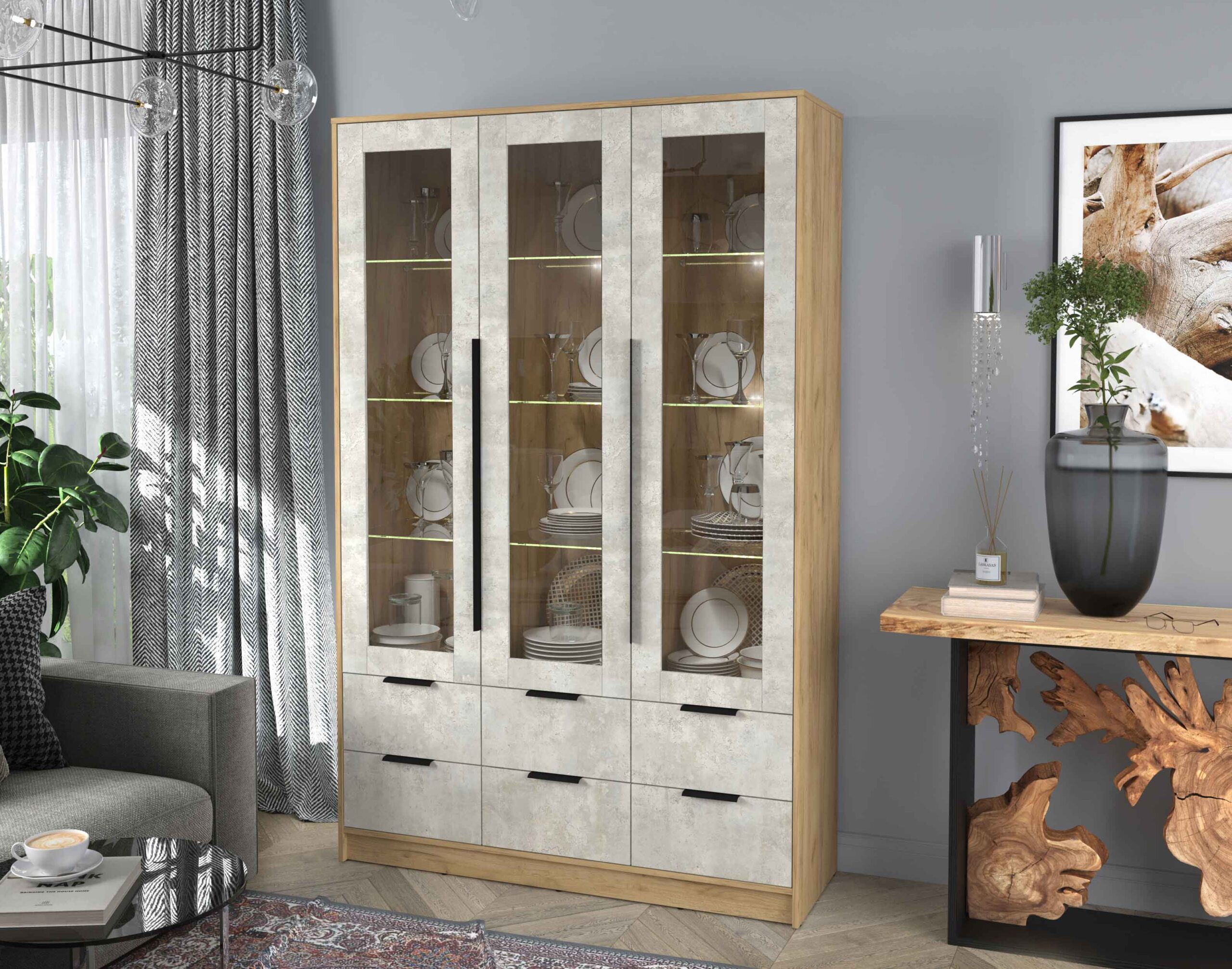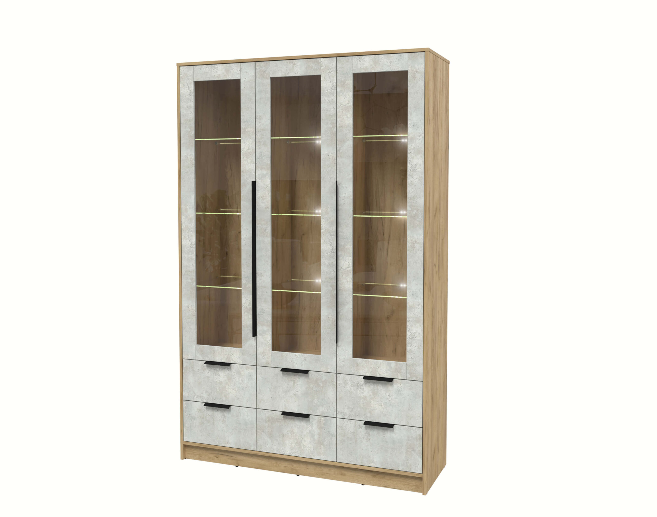ШКАФ С ВИТРИНОЙ КТ-ШВ3 С ПОДСВЕТКОЙ (ДУБ ЗОЛОТОЙ ЛДСП/ БЕТОН ЛАЙТ ЛДСП) Ш1360 В2128 Г451 - Yuta.by