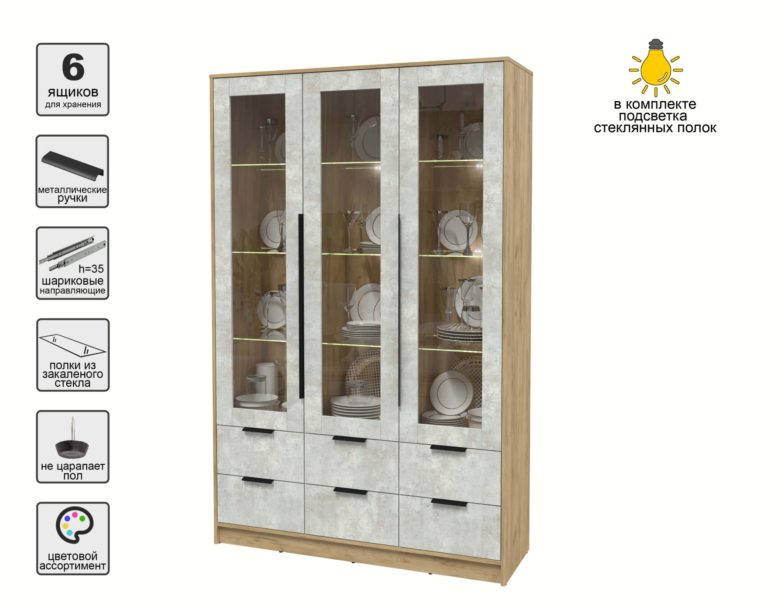 ШКАФ С ВИТРИНОЙ КТ-ШВ3 С ПОДСВЕТКОЙ (ДУБ ЗОЛОТОЙ ЛДСП/ БЕТОН ЛАЙТ ЛДСП) Ш1360 В2128 Г451