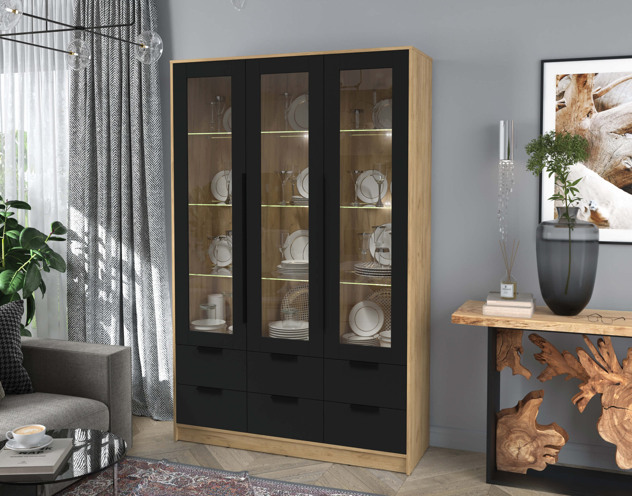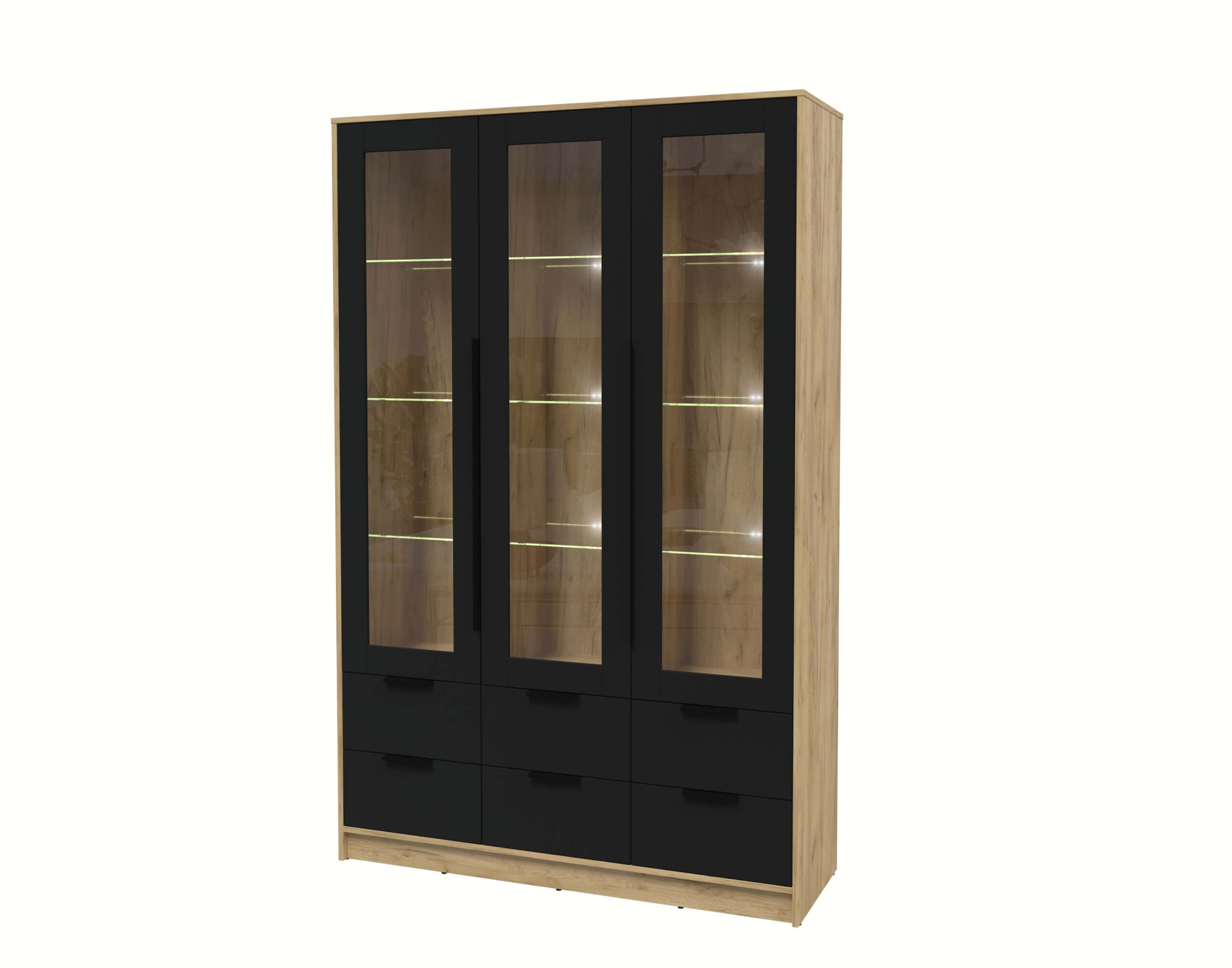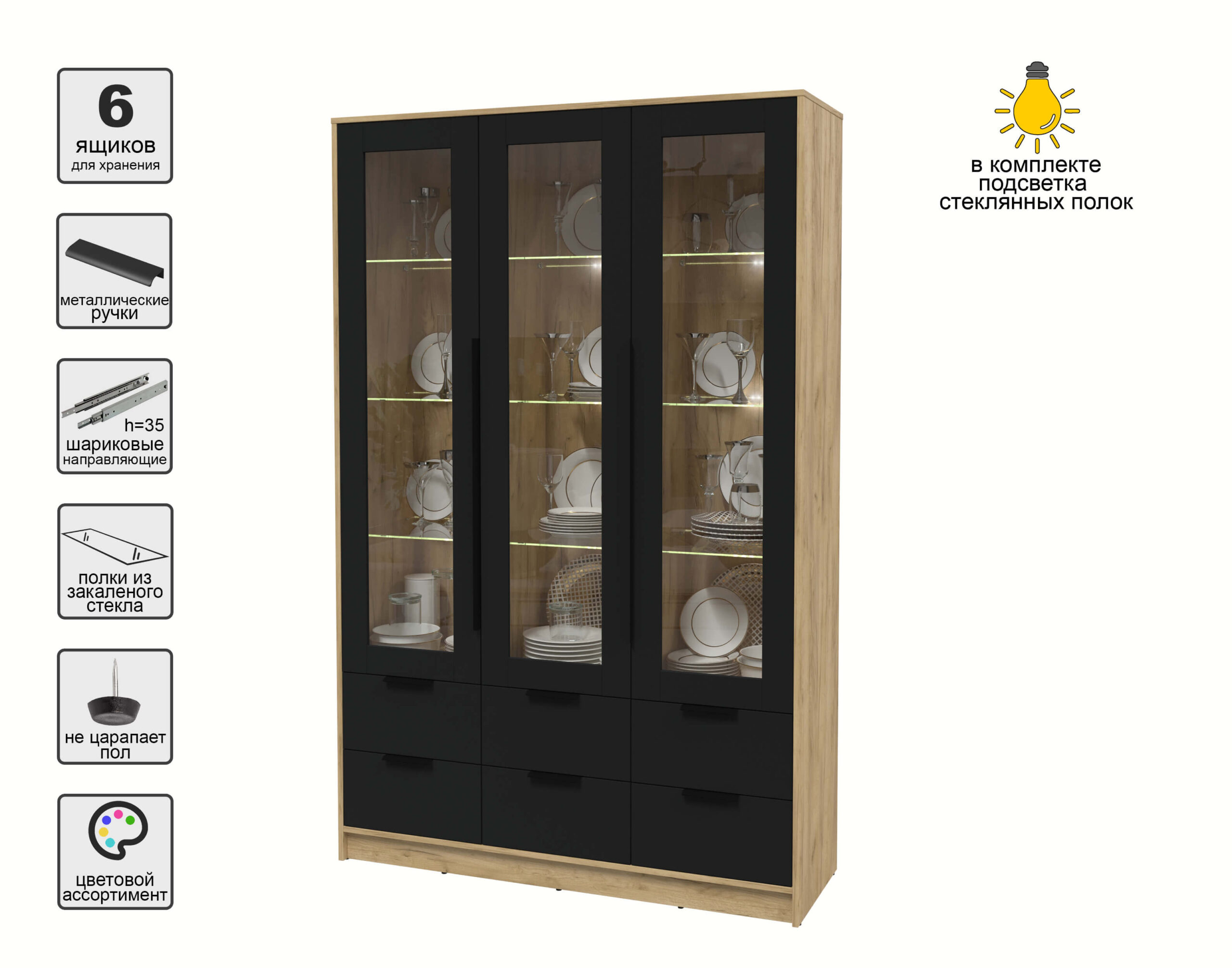 ШКАФ С ВИТРИНОЙ КТ-ШВ3 С ПОДСВЕТКОЙ (ДУБ ЗОЛОТОЙ ЛДСП/ ЧЕРНЫЙ ЛДСП) Ш1360 В2128 Г451 - Yuta.by