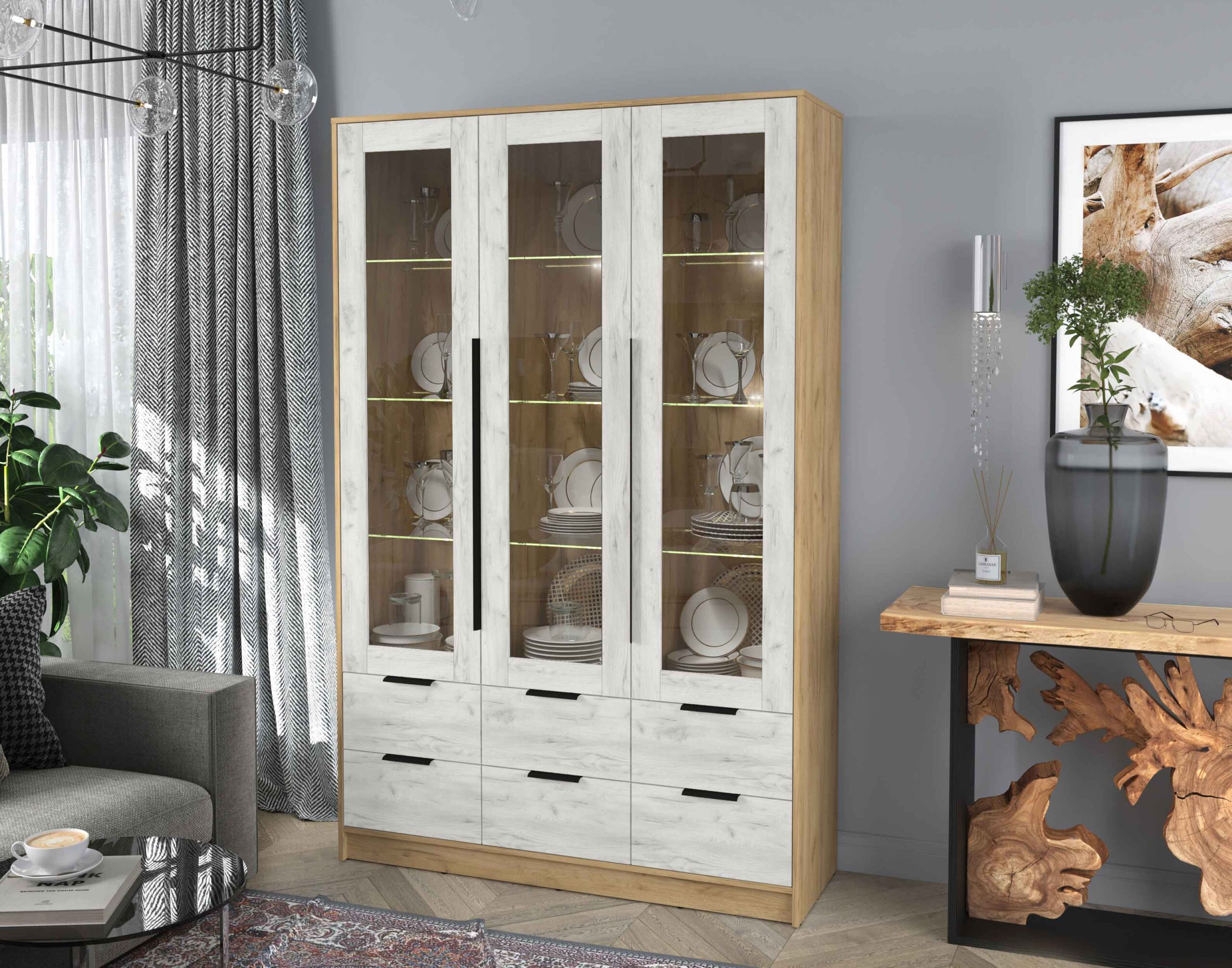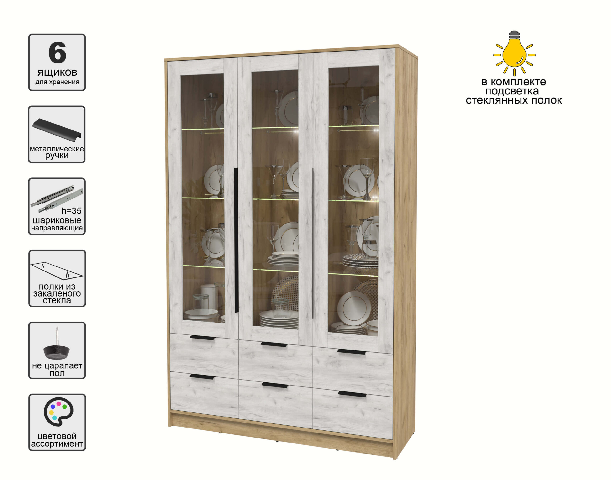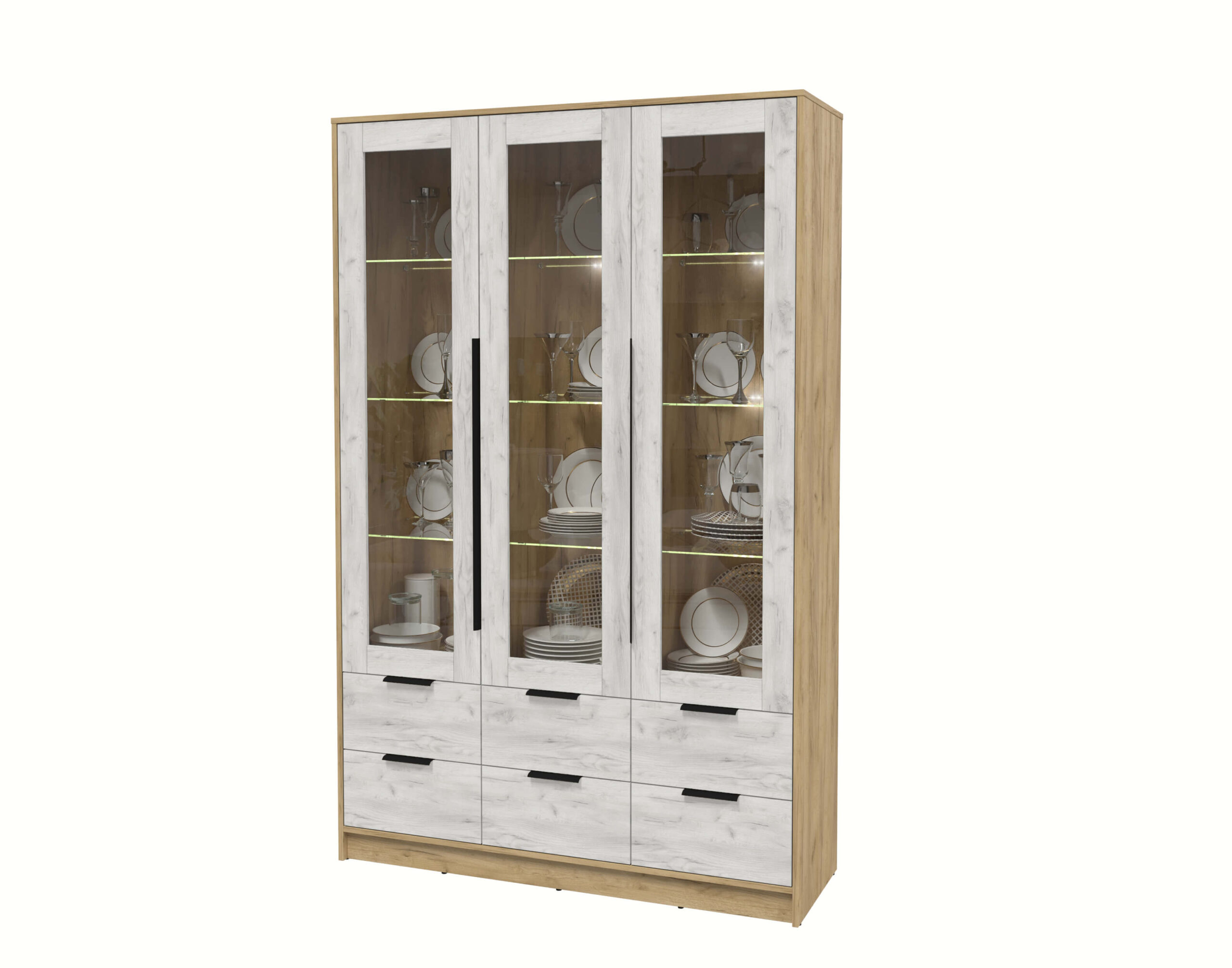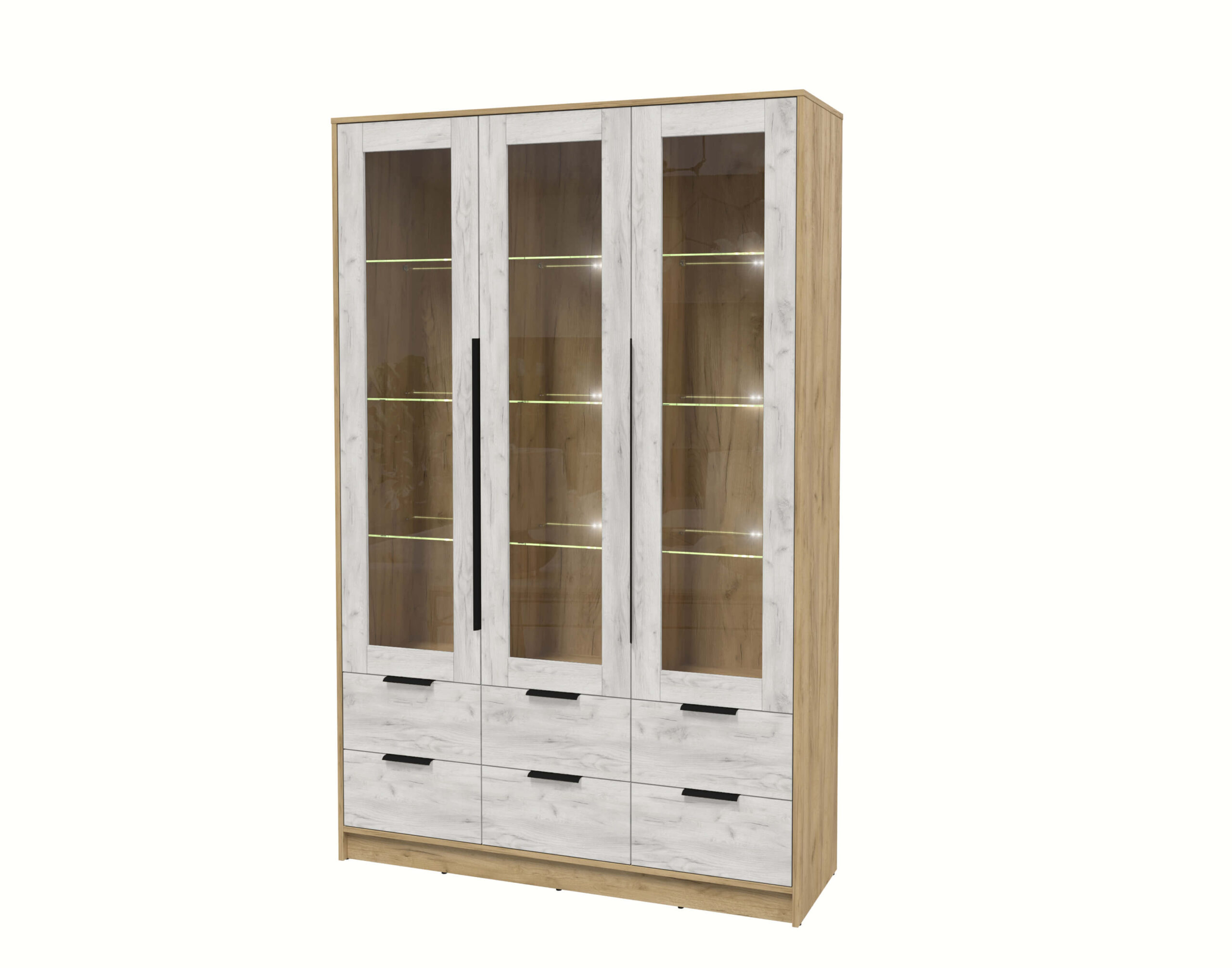 ШКАФ С ВИТРИНОЙ КТ-ШВ3 С ПОДСВЕТКОЙ (ДУБ ЗОЛОТОЙ ЛДСП/ ДУБ БЕЛЫЙ ЛДСП) Ш1360 В2128 Г451 - Yuta.by