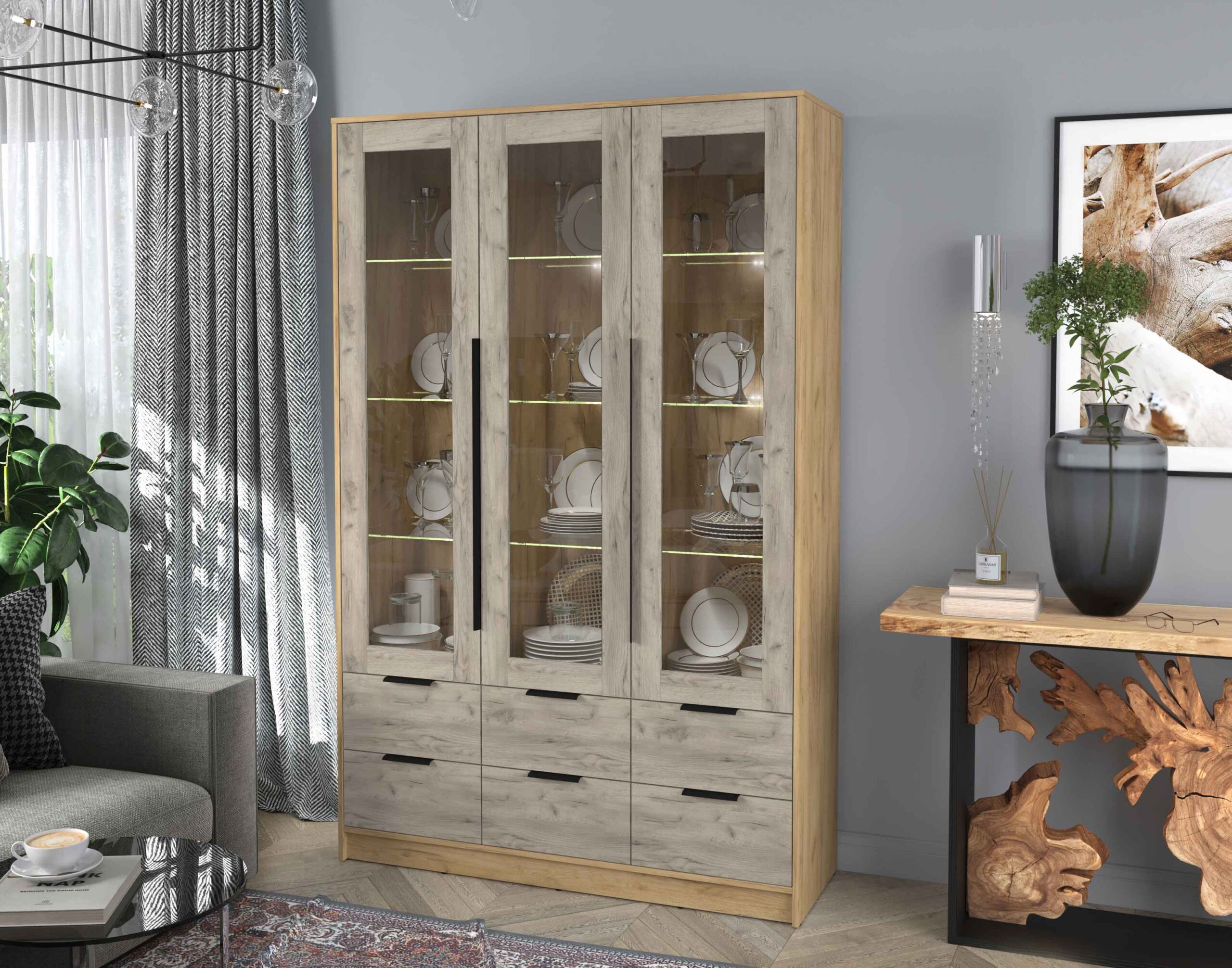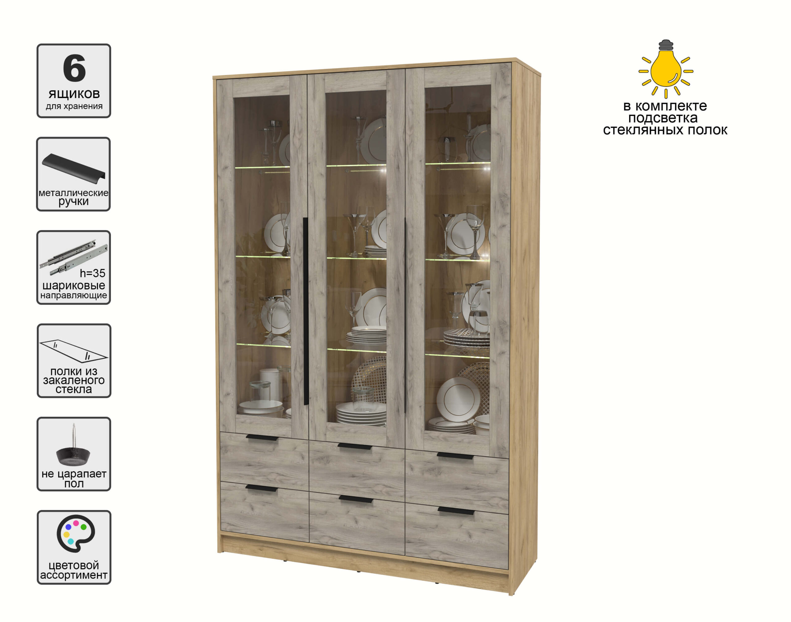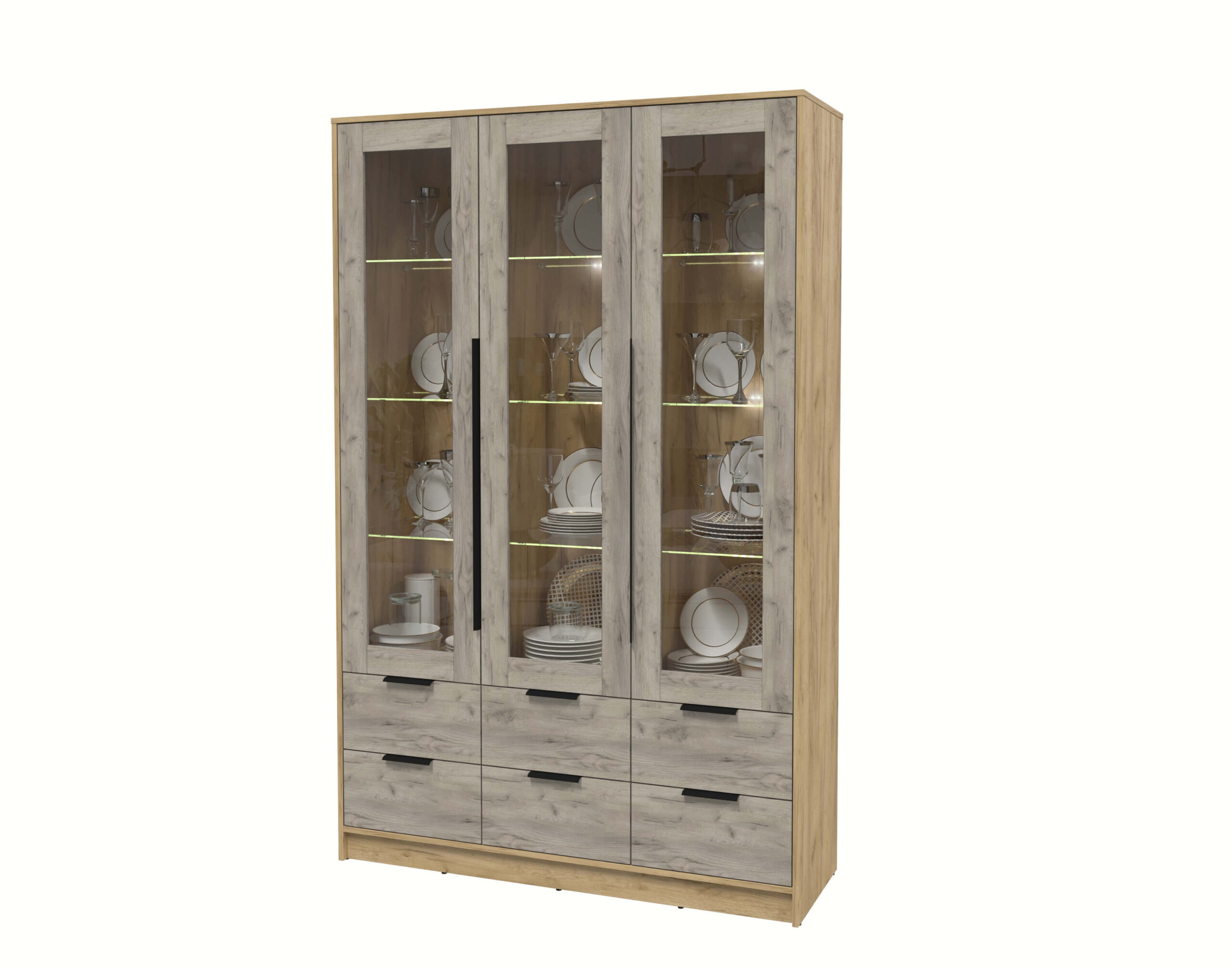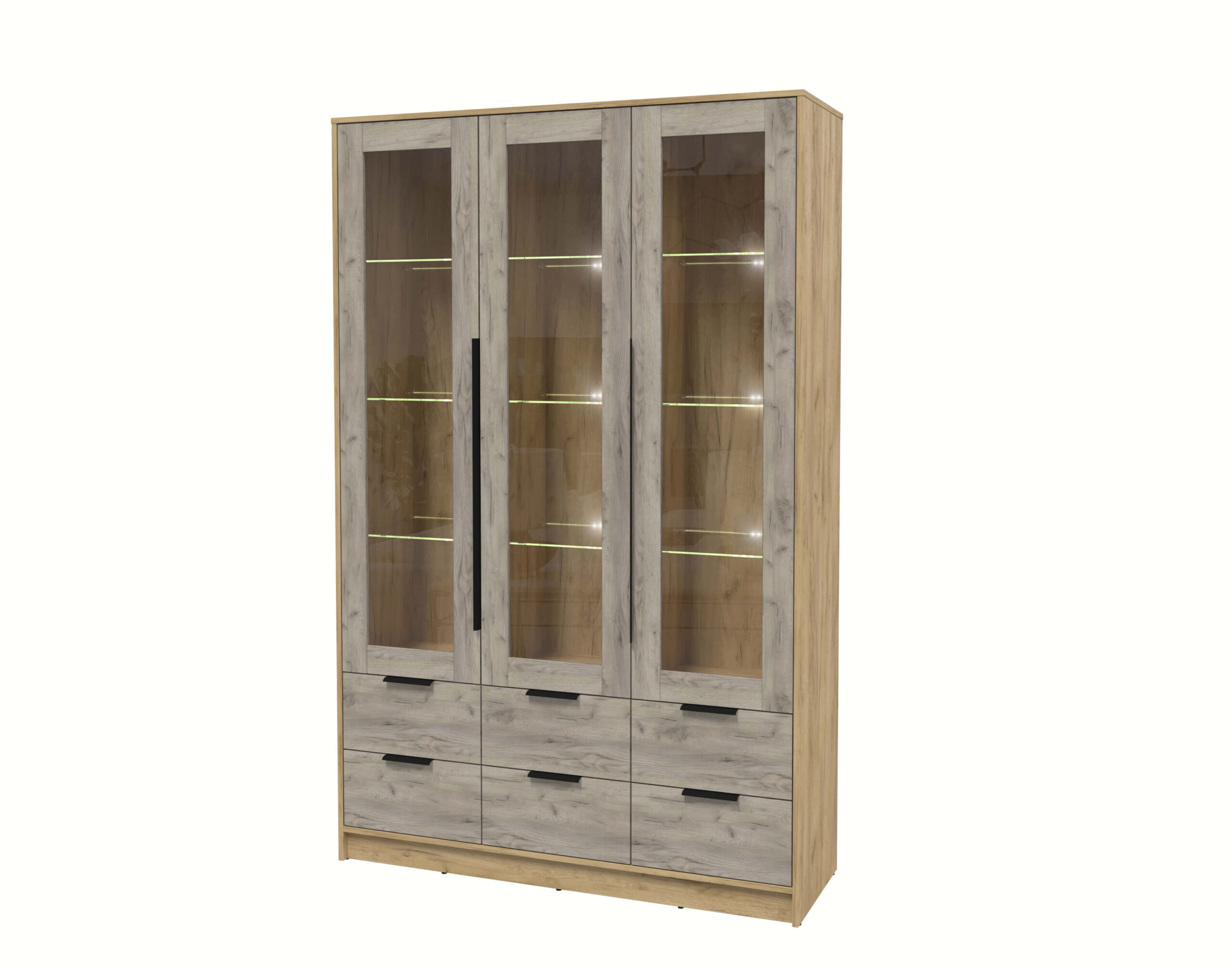ШКАФ С ВИТРИНОЙ КТ-ШВ3 С ПОДСВЕТКОЙ (ДУБ ЗОЛОТОЙ ЛДСП/ ДУБ СЕРЫЙ ЛДСП) Ш1360 В2128 Г451 - Yuta.by