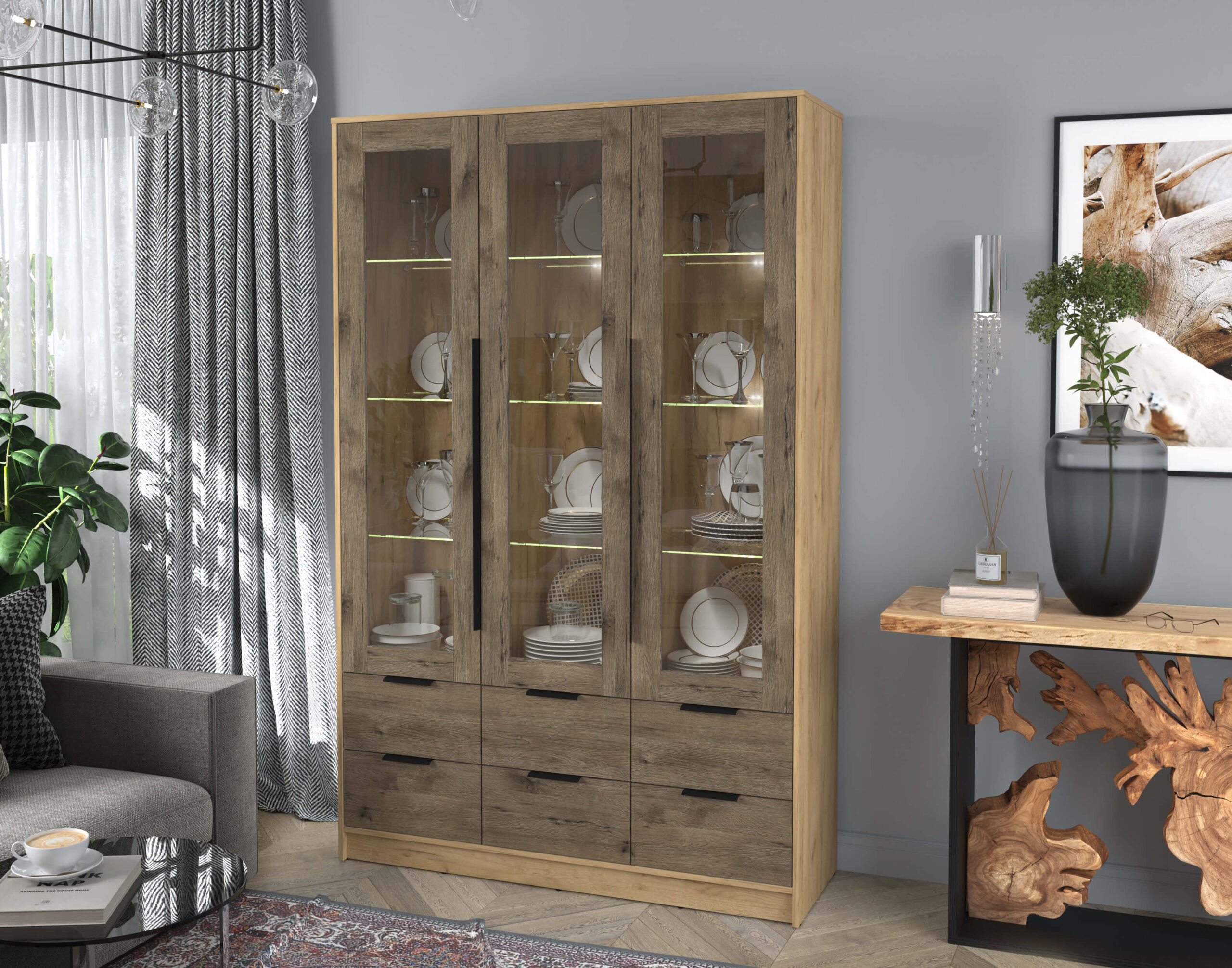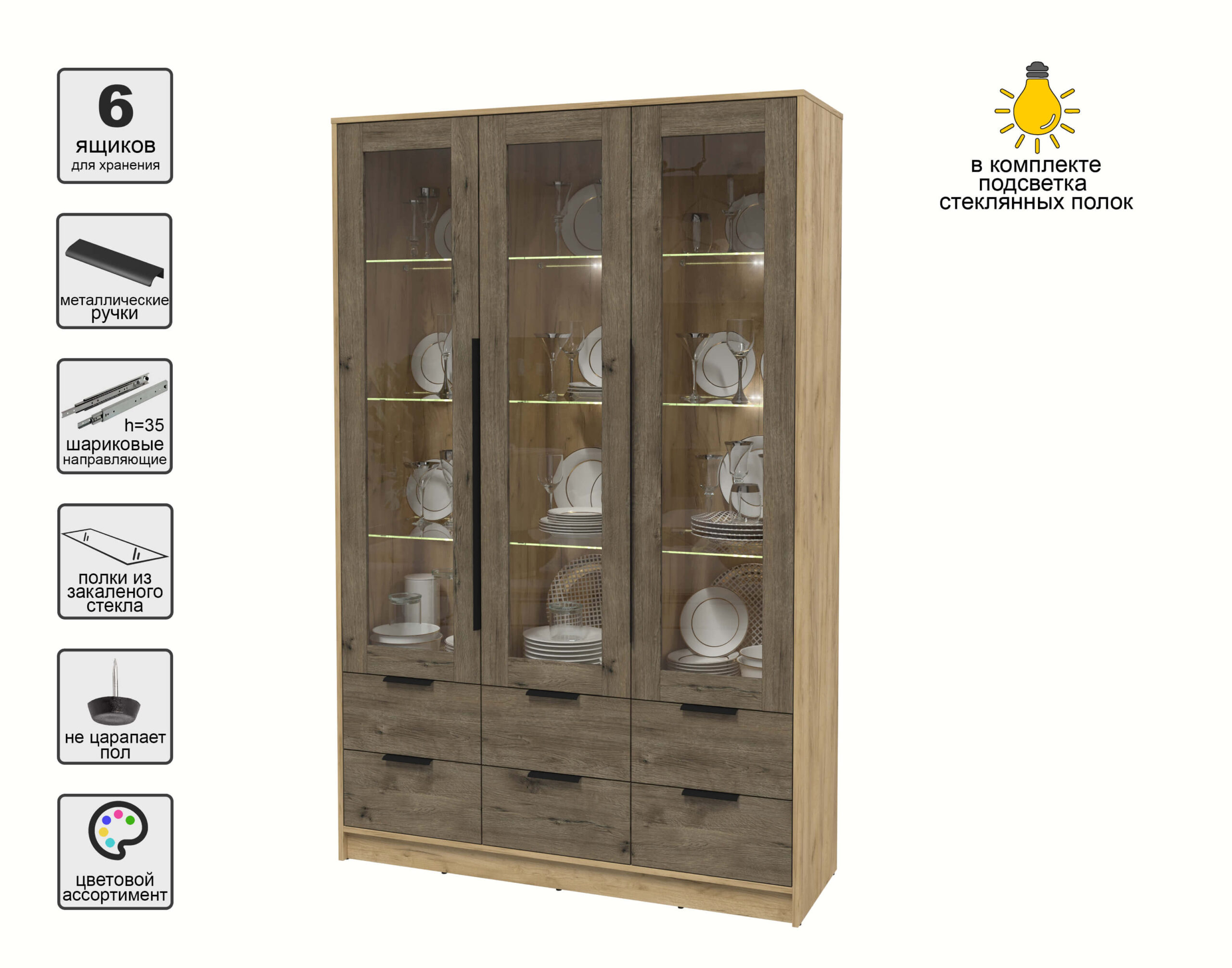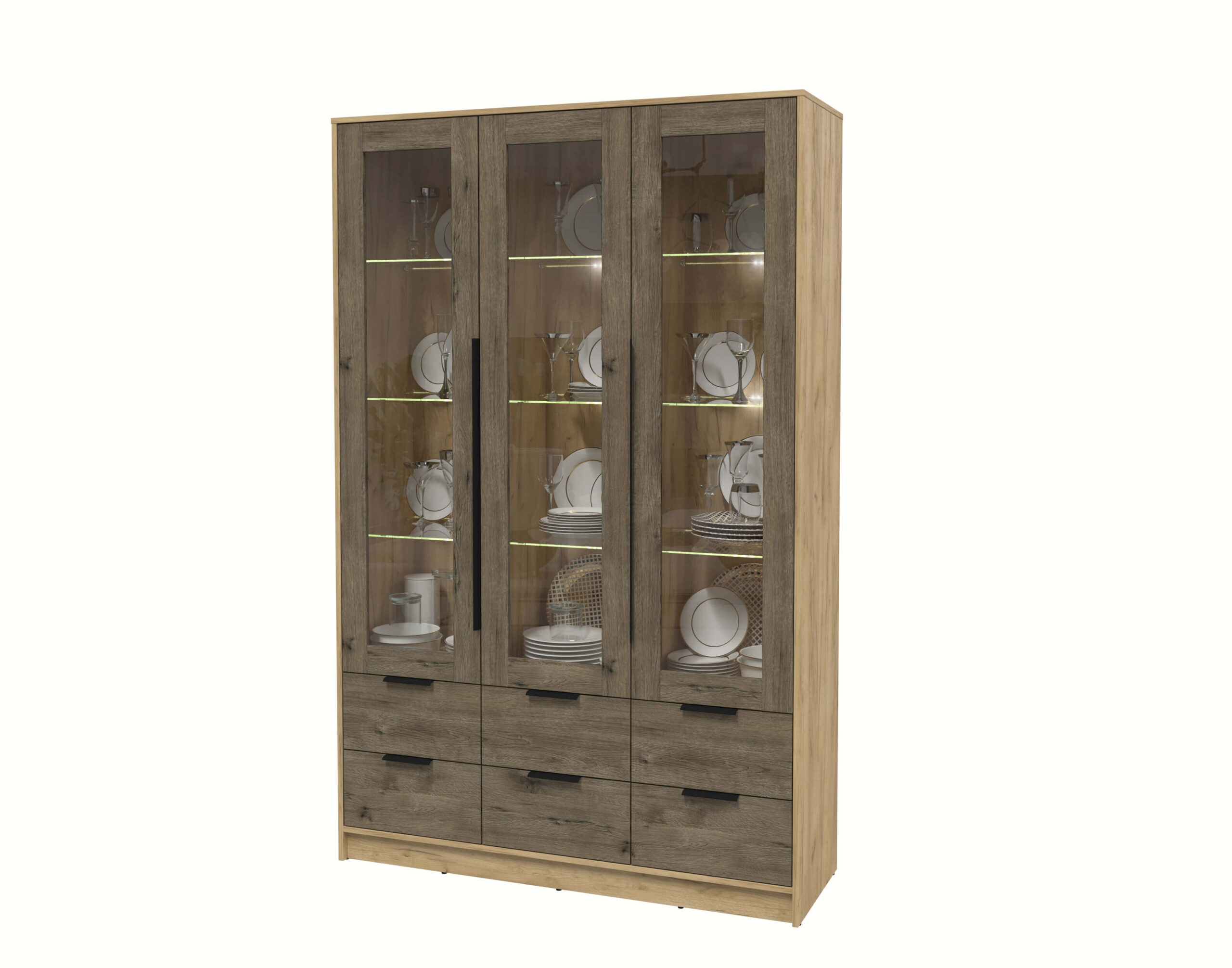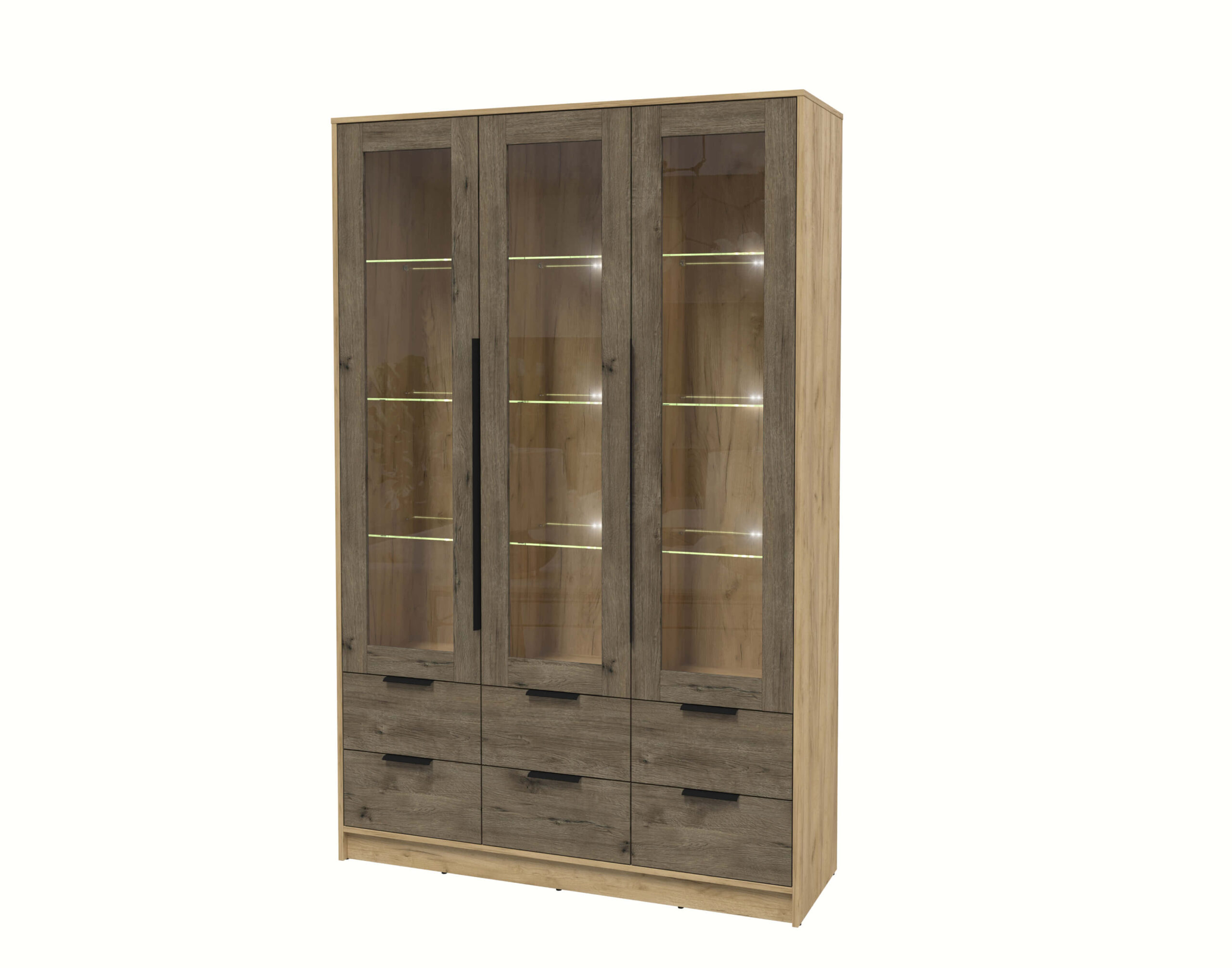 ШКАФ С ВИТРИНОЙ КТ-ШВ3 С ПОДСВЕТКОЙ (ДУБ ЗОЛОТОЙ ЛДСП/ ДУБ ВЕЛЛИНГТОН ЛДСП) Ш1360 В2128 Г451 - Yuta.by